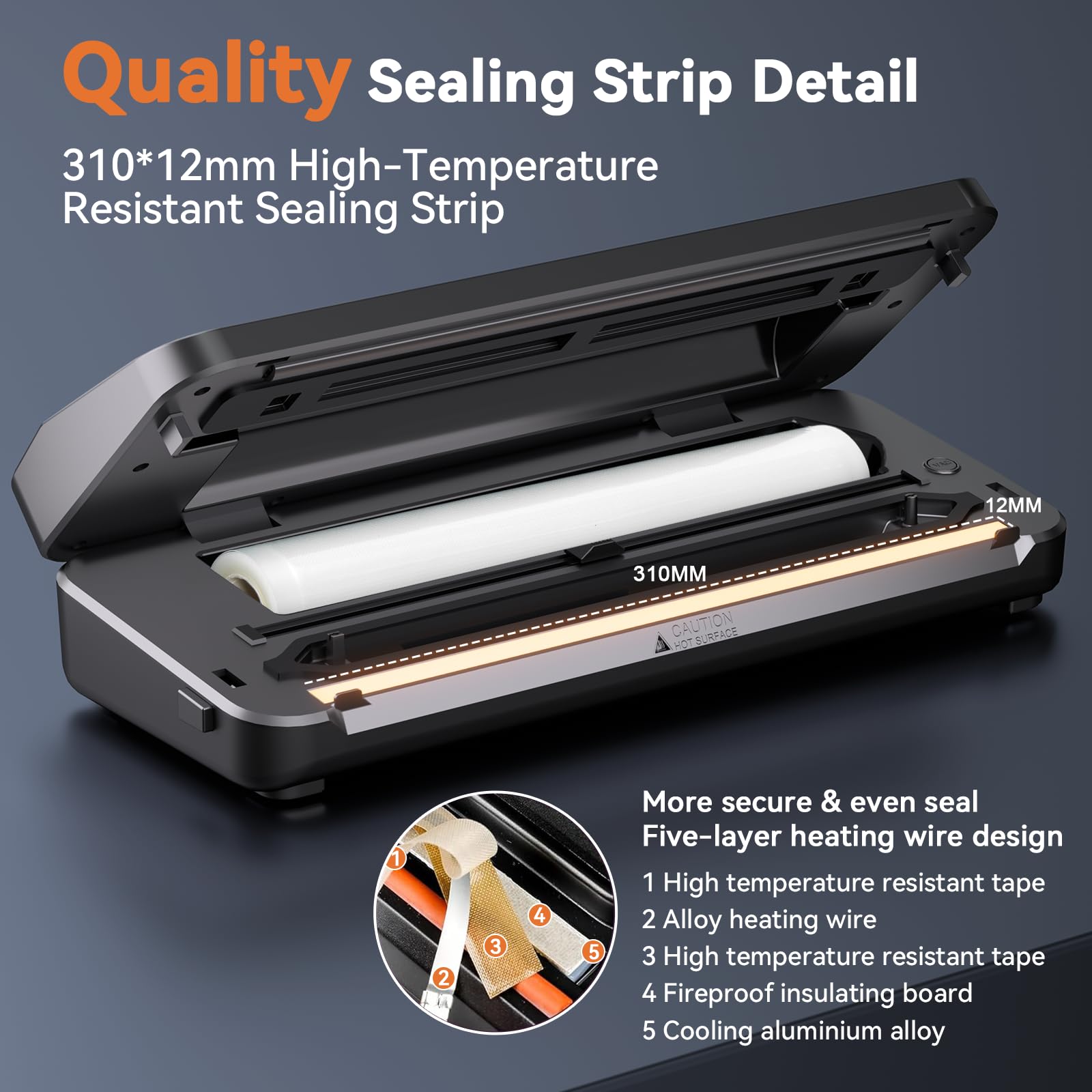Der Bidirektionale Beutelschneider mit hochwertigen Kohlenstoffstahlklingen sorgt für exakte Schnitte und kann bis zu 20.000 Mal schneiden. Die 12"-Heizstreifen ermöglichen das Versiegeln von 3-5 Beuteln gleichzeitig und garantieren eine langlebige Nutzung mit über 70 Versiegelungen. Der abnehmbare Silikonstreifen ist waschbar und sorgt für eine gesunde Nutzung.