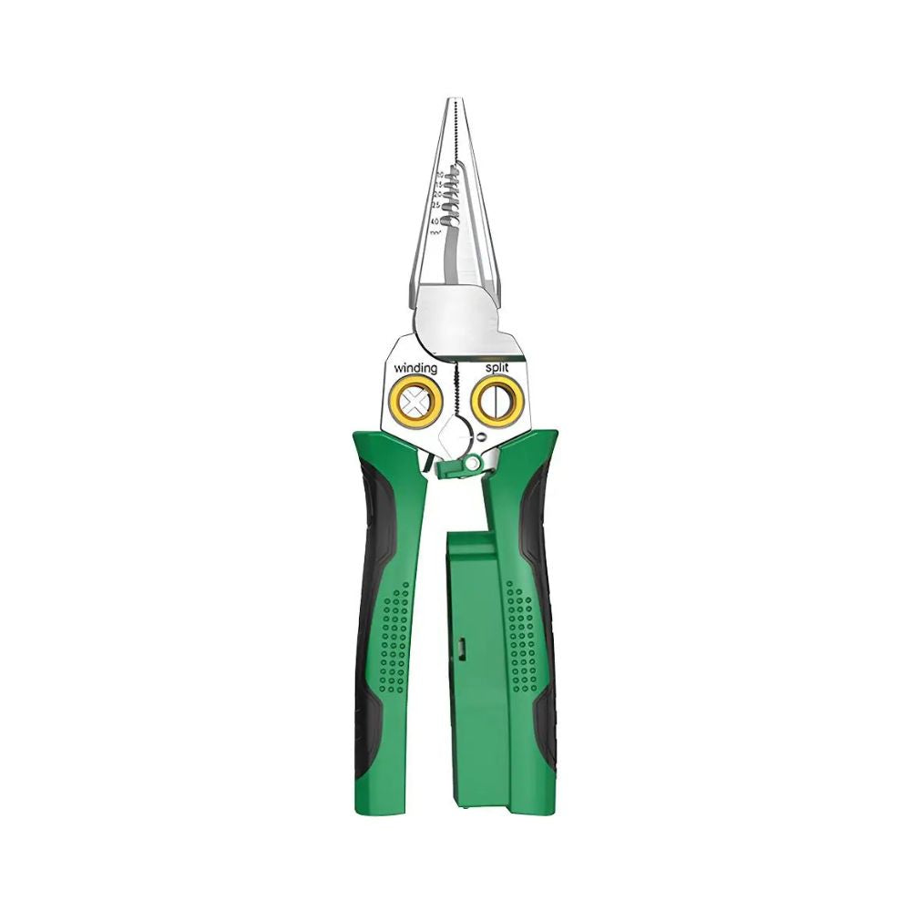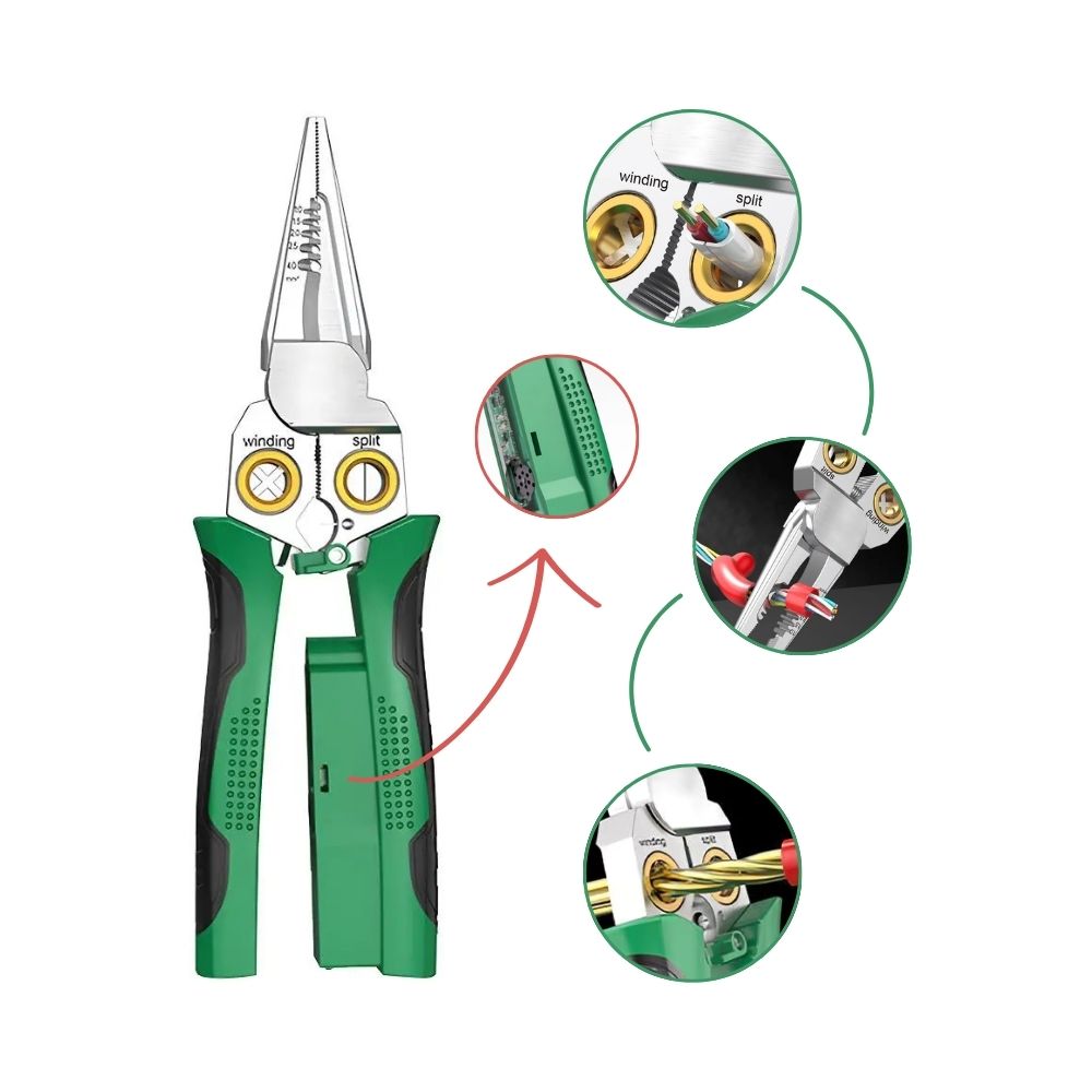 Dieses 8-in-1 Multifunktions-Werkzeug vereint alle wichtigen Funktionen, die Elektriker benötigen: Schneiden, Abisolieren, Kabel teilen, wickeln, öffnen, ziehen und mehr...