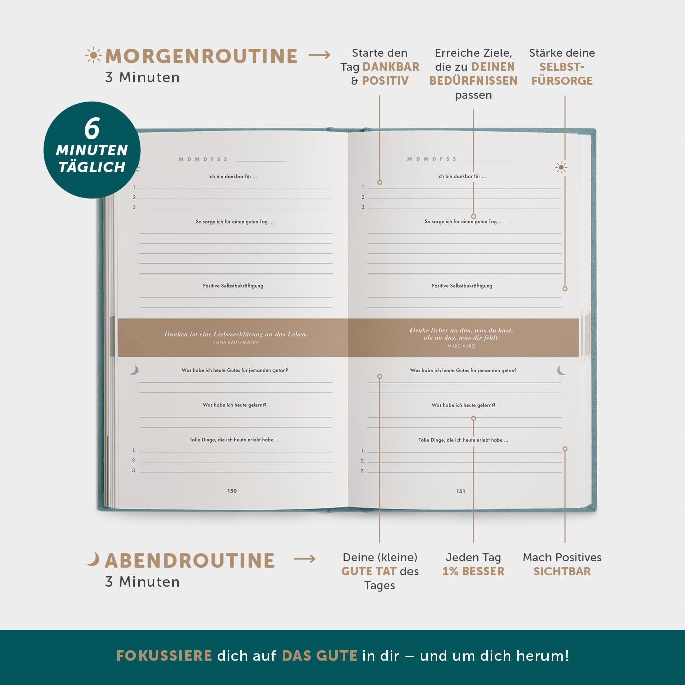 Mit dem beliebtesten Dankbarkeitstagebuch der Welt findest du durch tägliches Journaling heraus, was dich erfüllt - und holst mehr davon in dein Leben.