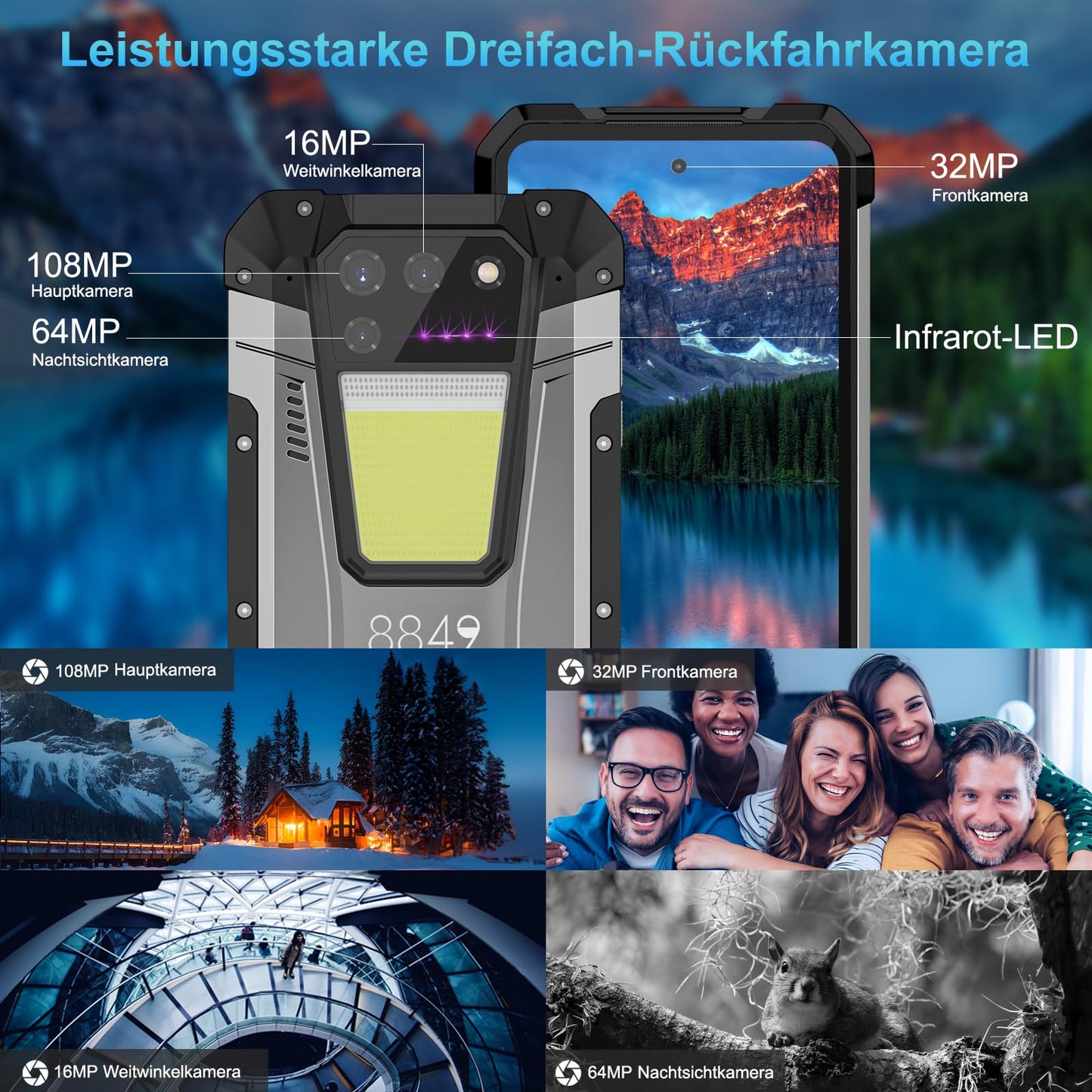 - Hochauflösende Kameras: 108 MP Hauptkamera, 64 MP Nachtsichtkamera, 32 MP Frontkamera und 16 MP Weitwinkelkamera für herausragende Aufnahmen bei Tag und Nacht.