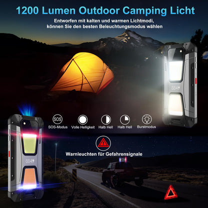 - Campinglicht: 1200 Lumen Helligkeit, 5 Modi (u.a. SOS-Signal) und zusätzliches Warnlicht - ideal für Outdoor-Aktivitäten.