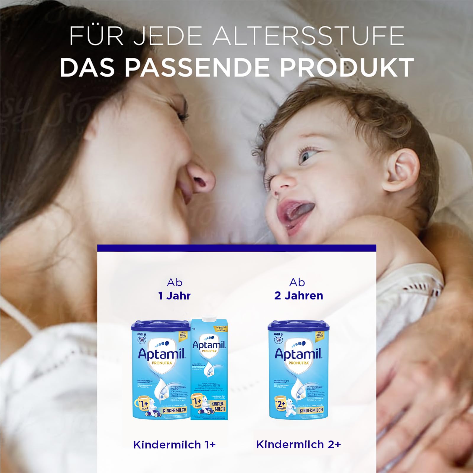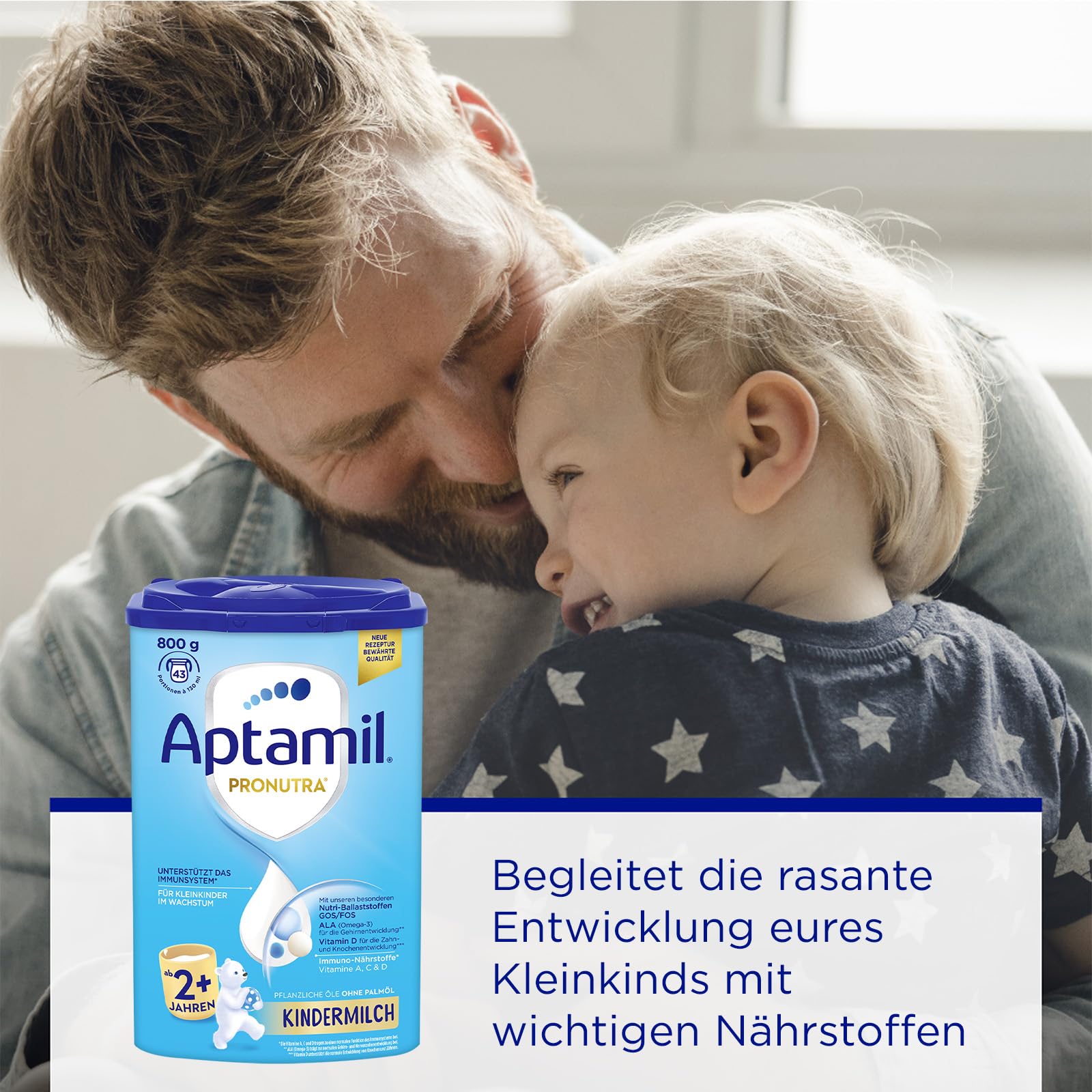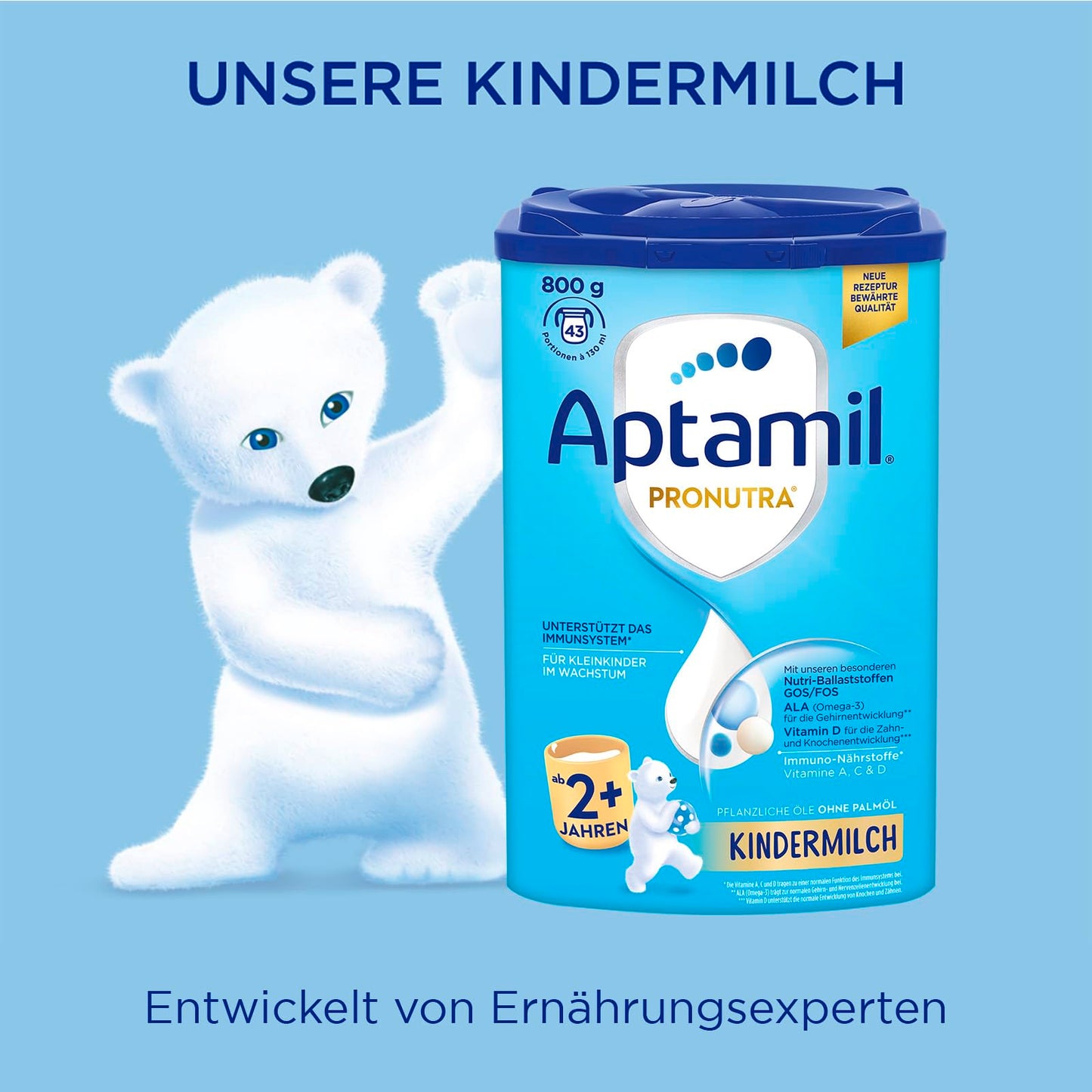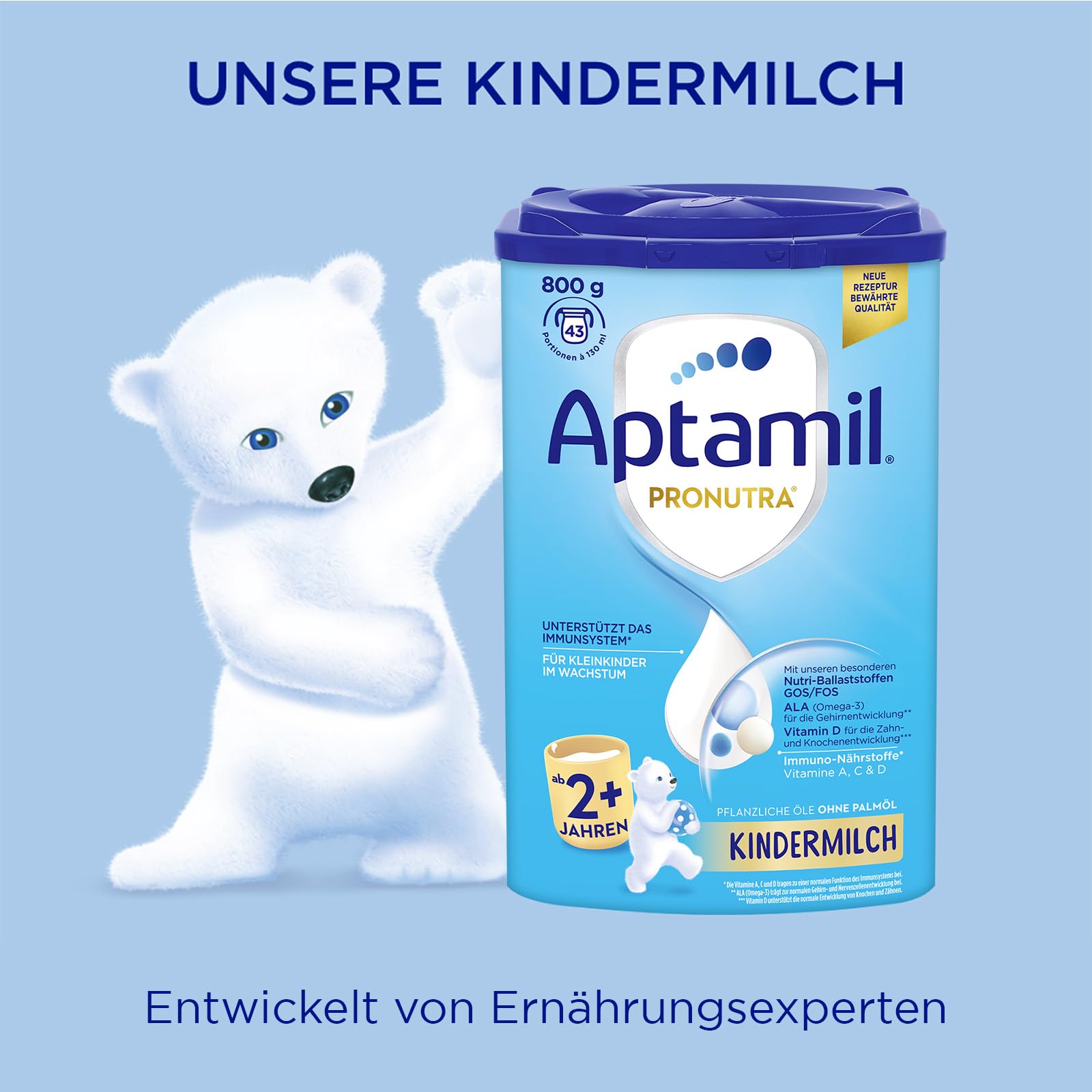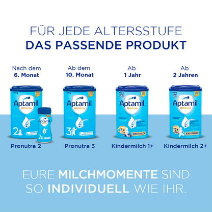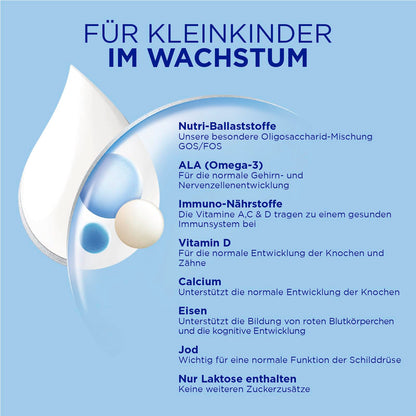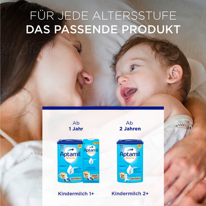 Aptamil Kindermilch 2+ ist speziell für Kleinkinder ab 2 Jahren entwickelt - mit Vitaminen A, C & D für das Immunsystem, Eisen für die kognitive Entwicklung und Omega-3 (ALA) für Gehirn und Nerven.