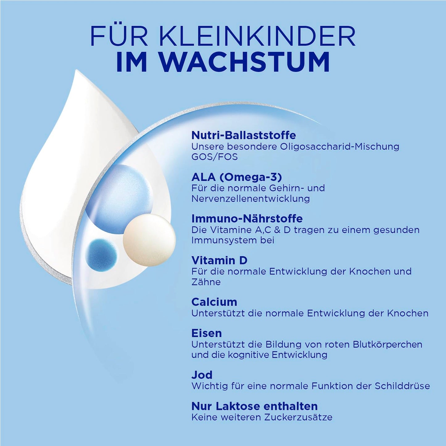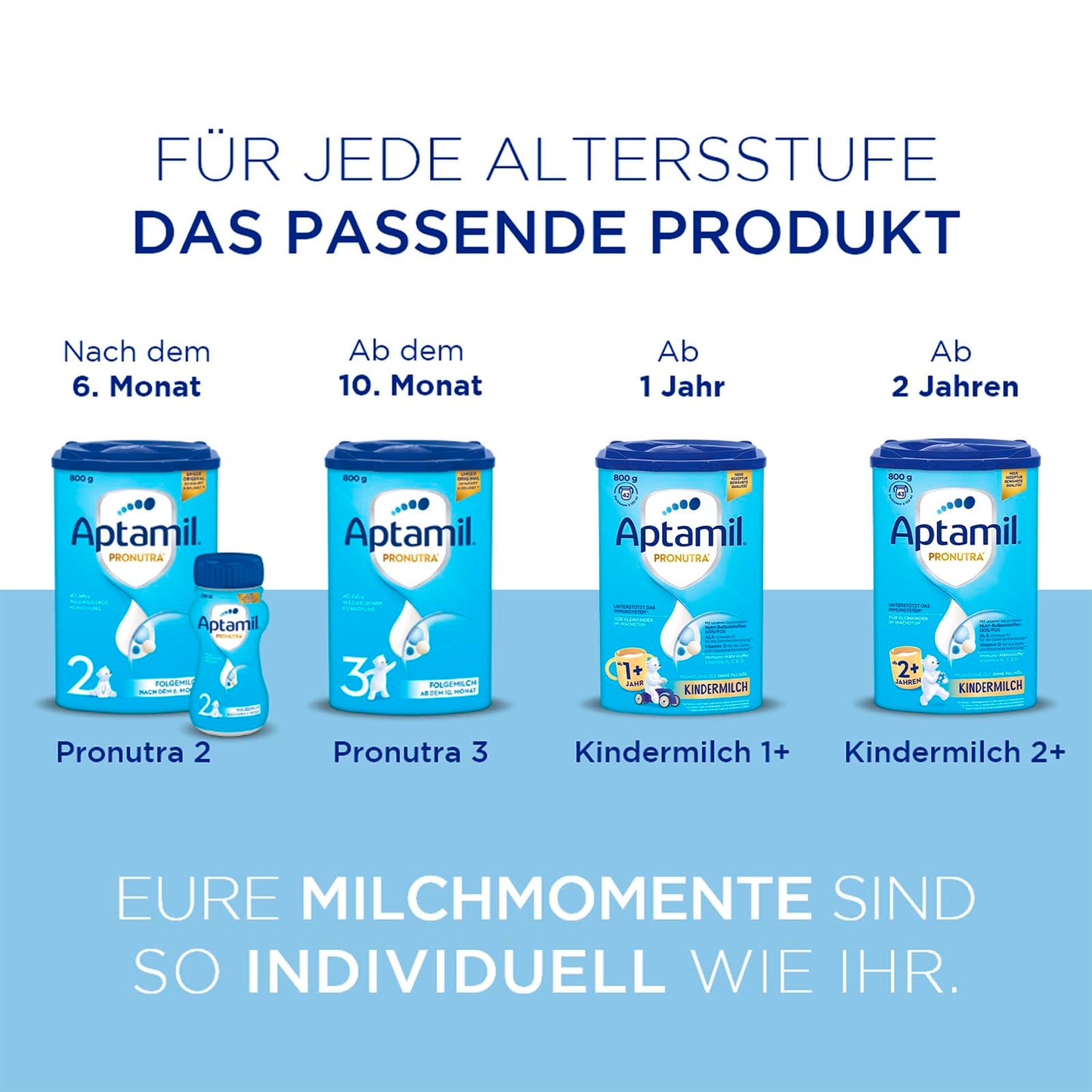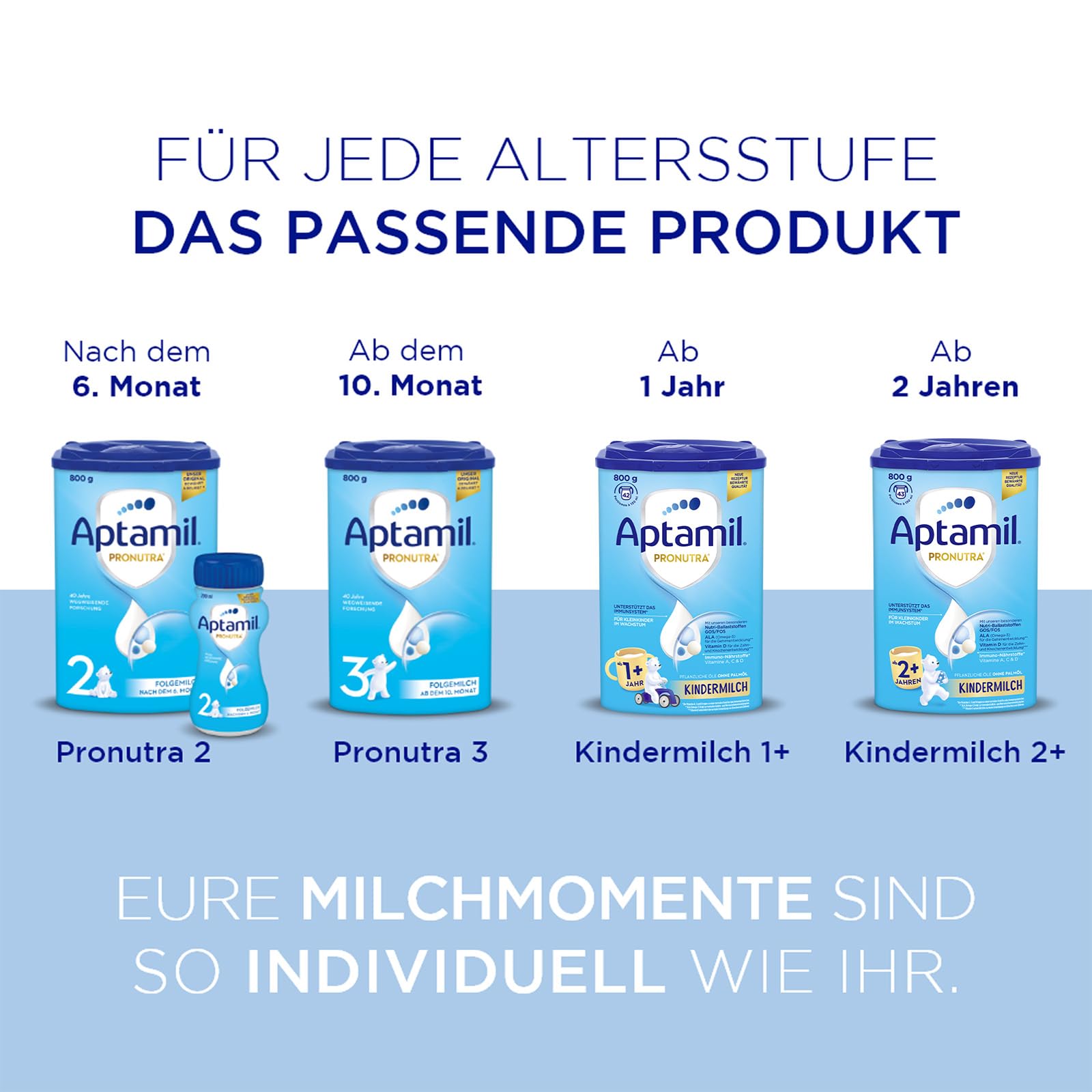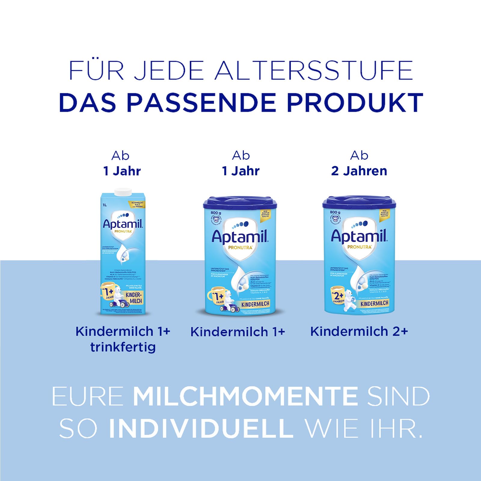Aptamil Kindermilch 2+ ist speziell für Kleinkinder ab 2 Jahren entwickelt - mit Vitaminen A, C & D für das Immunsystem, Eisen für die kognitive Entwicklung und Omega-3 (ALA) für Gehirn und Nerven.