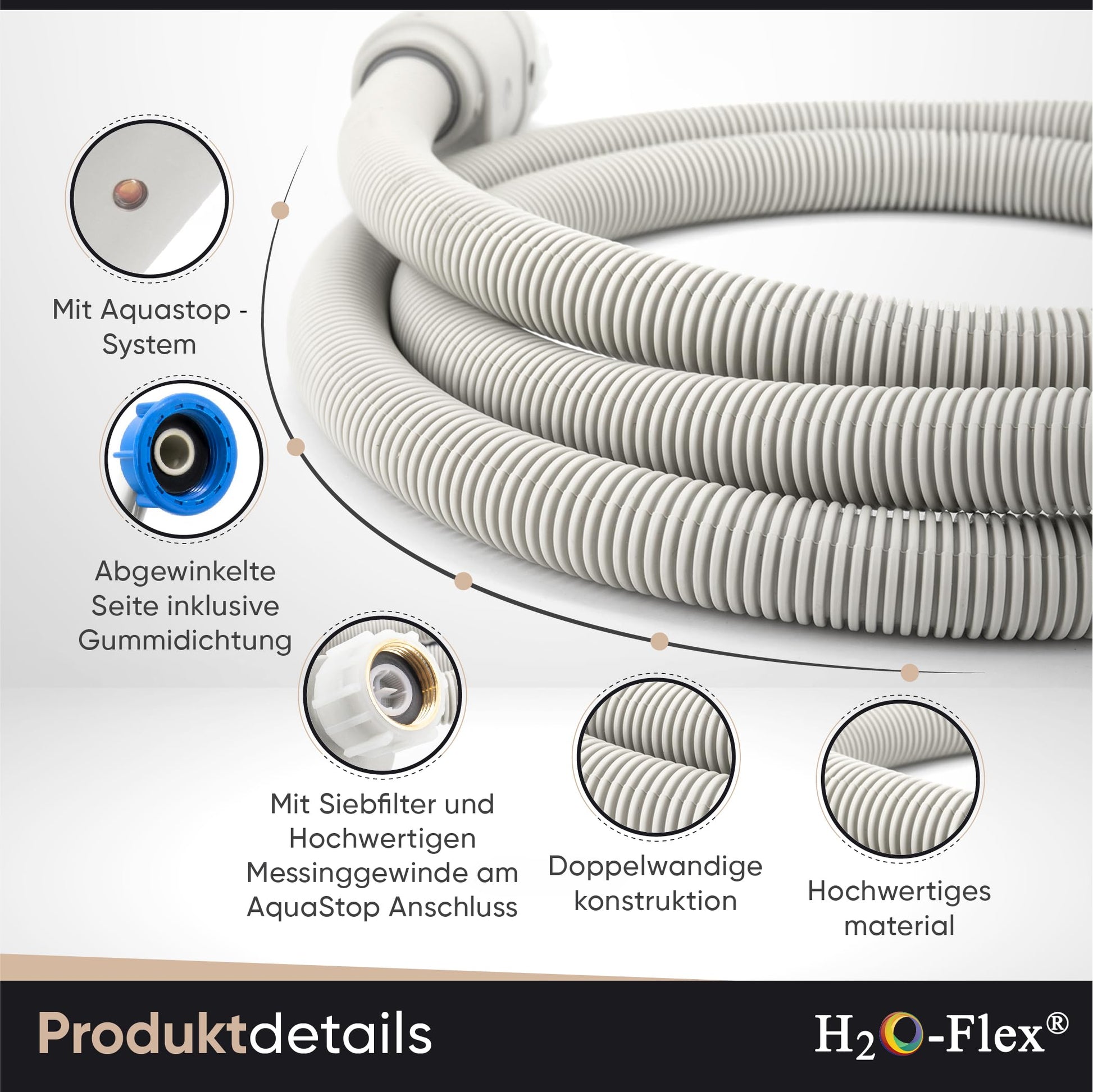 Mit einer Länge von 2m, Temperaturbeständigkeit bis 90 °C und 3/4" Anschluss mit 90° Bogen ist der Schlauch ideal für Haushaltsgeräte geeignet. Inklusive Dichtung - von Versicherungen als Leckageschutz anerkannt.