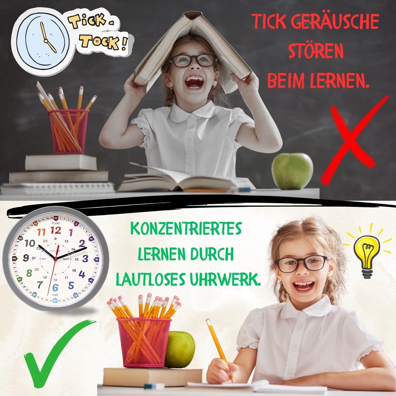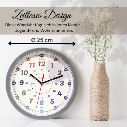 Die farbenfrohe Wanduhr mit kindgerechtem Ziffernblatt ist ideal als Geschenk zur Einschulung oder zum Geburtstag. Perfekt für Kinderzimmer, mit lautlosem Uhrwerk für ruhige Nächte.