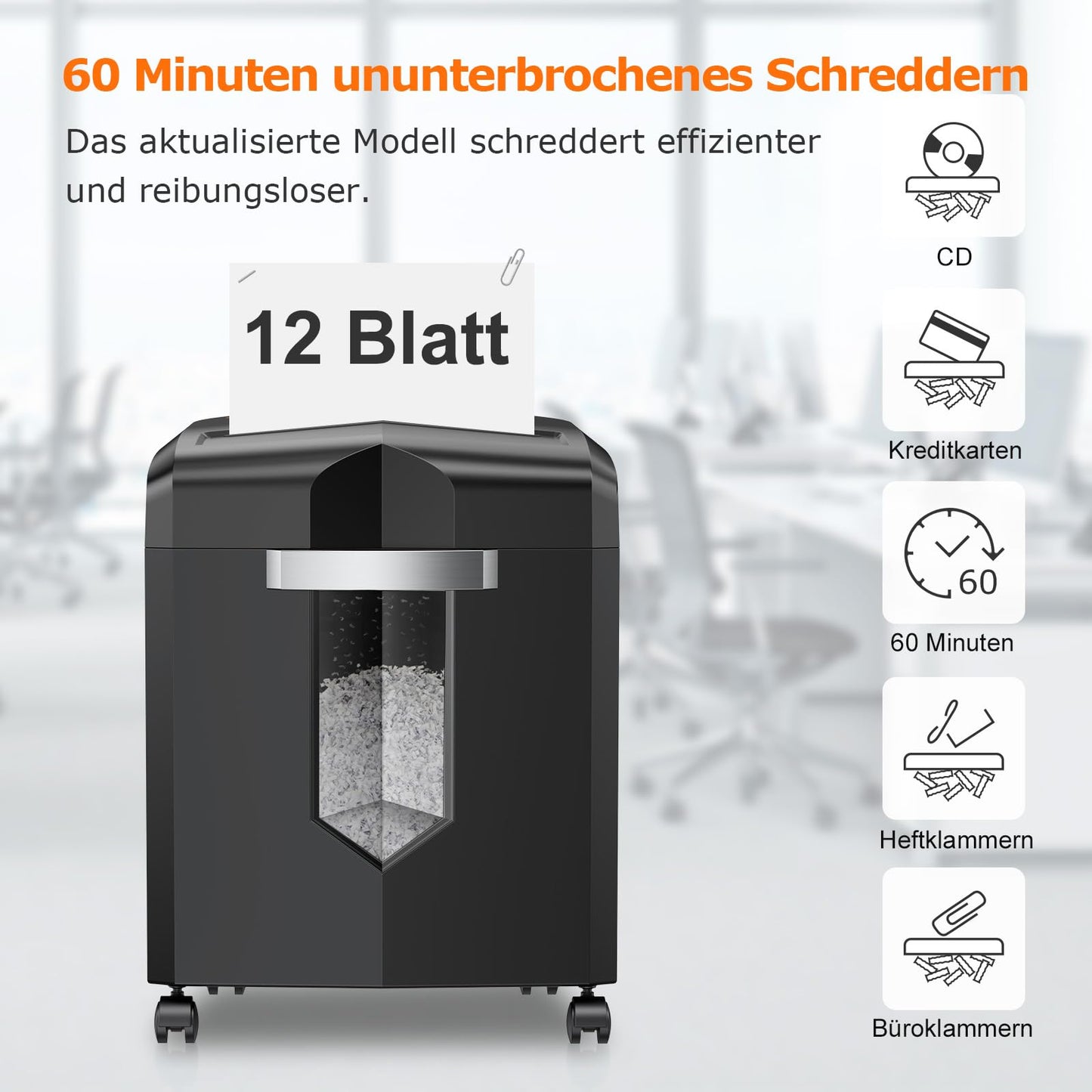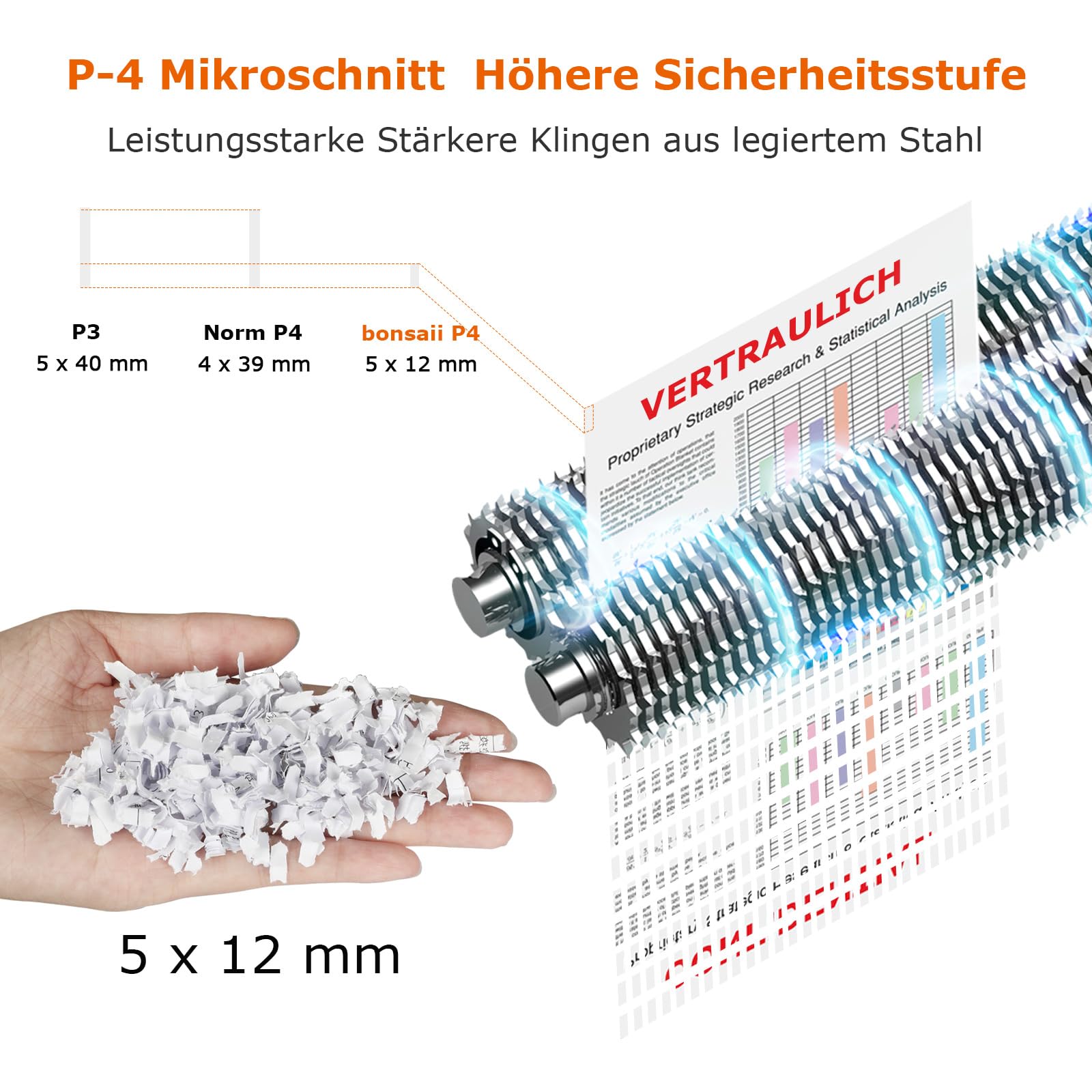 - [ P-4 Hochsicherheitsstufe ] Mikroschnitt-Aktenvernichter für Bürogebrauch, zerkleinern Sie nicht nur 12 Blätter auf einmal zu winzigen Partikeln von 5 x 12 mm, sondern auch CDs, Kreditkarten, E-Mails, Heftklammern und Büroklammern. Maximale Sicherheit für Ihre sensiblen Informationen