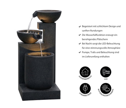 Sie sitzen an einem schönen Sommertag auf der Terrasse und schauen über Ihre Blumen und blühenden Büsche, während im Hintergrund ein sanftes Wasserplätschern zu hören ist. Und während Sie die wunderbar entspannende Atmosphäre genießen, werden Sie sich jedes Mal aufs Neue dazu beglückwünschen, sich für den Dehner Polyresin-Gartenbrunnen Samson entschieden zu haben. Denn kein anderer macht die erholsame Atmosphäre so perfekt wie dieser Brunnen. Er ist einem klassischen Kaskadenbrunnen nachempfunden, bei dem das Wasser über einzelne Stufen nach unten fließt, er ist aber mit seiner geradlinigen Säulenform und den modern gestalteten Wasserschalen ein zeitgemäßes Deko-Objekt, das sich in viele auch moderne Gartenanlagen intergieren lässt. Gönnen Sie sich das Besondere und entscheiden Sie sich für den Dehner Polyresin-Gartenbrunnen Samson!