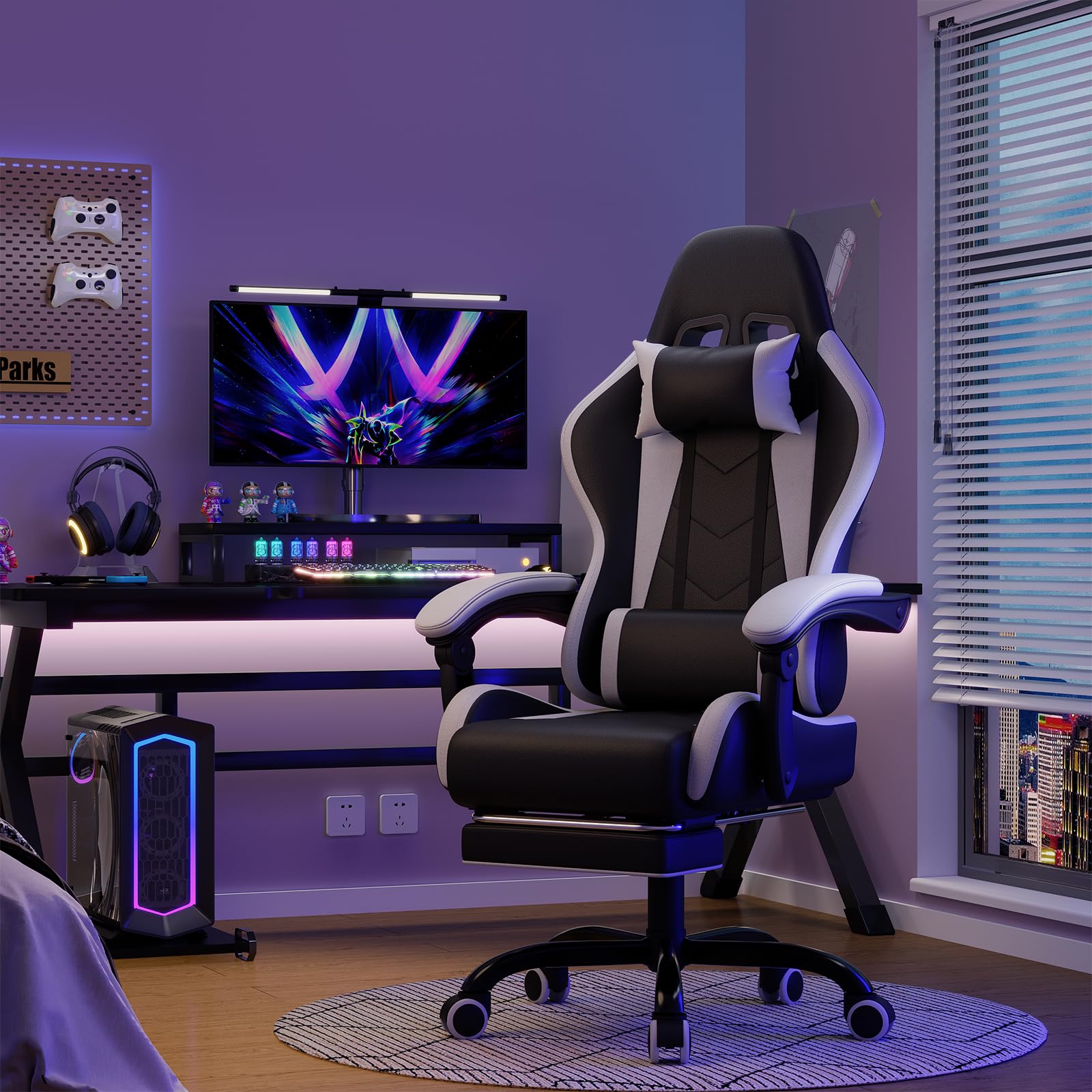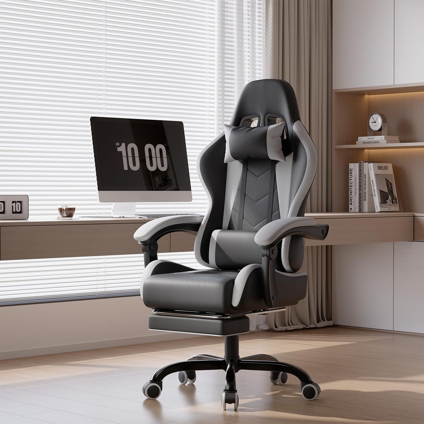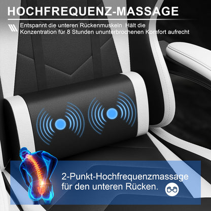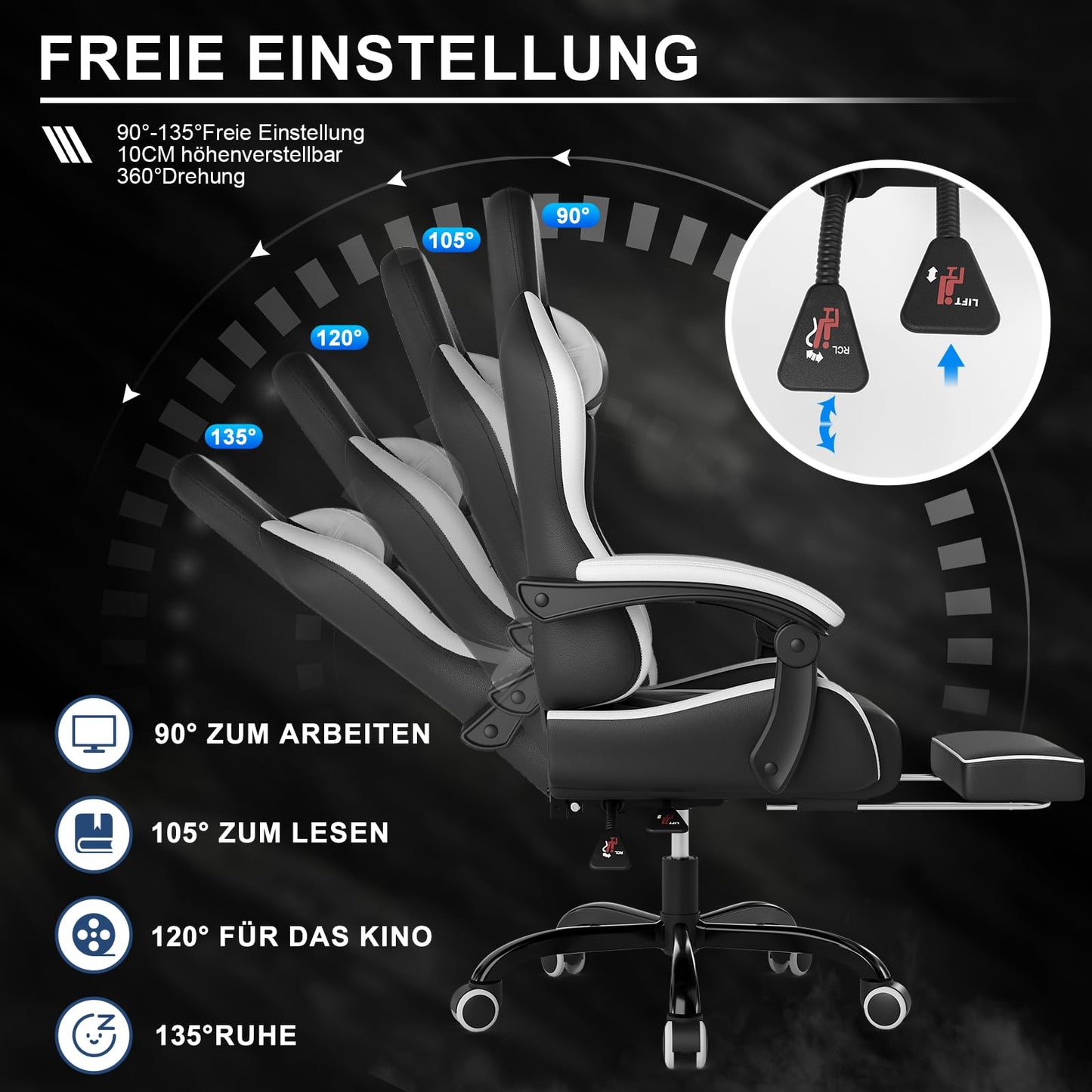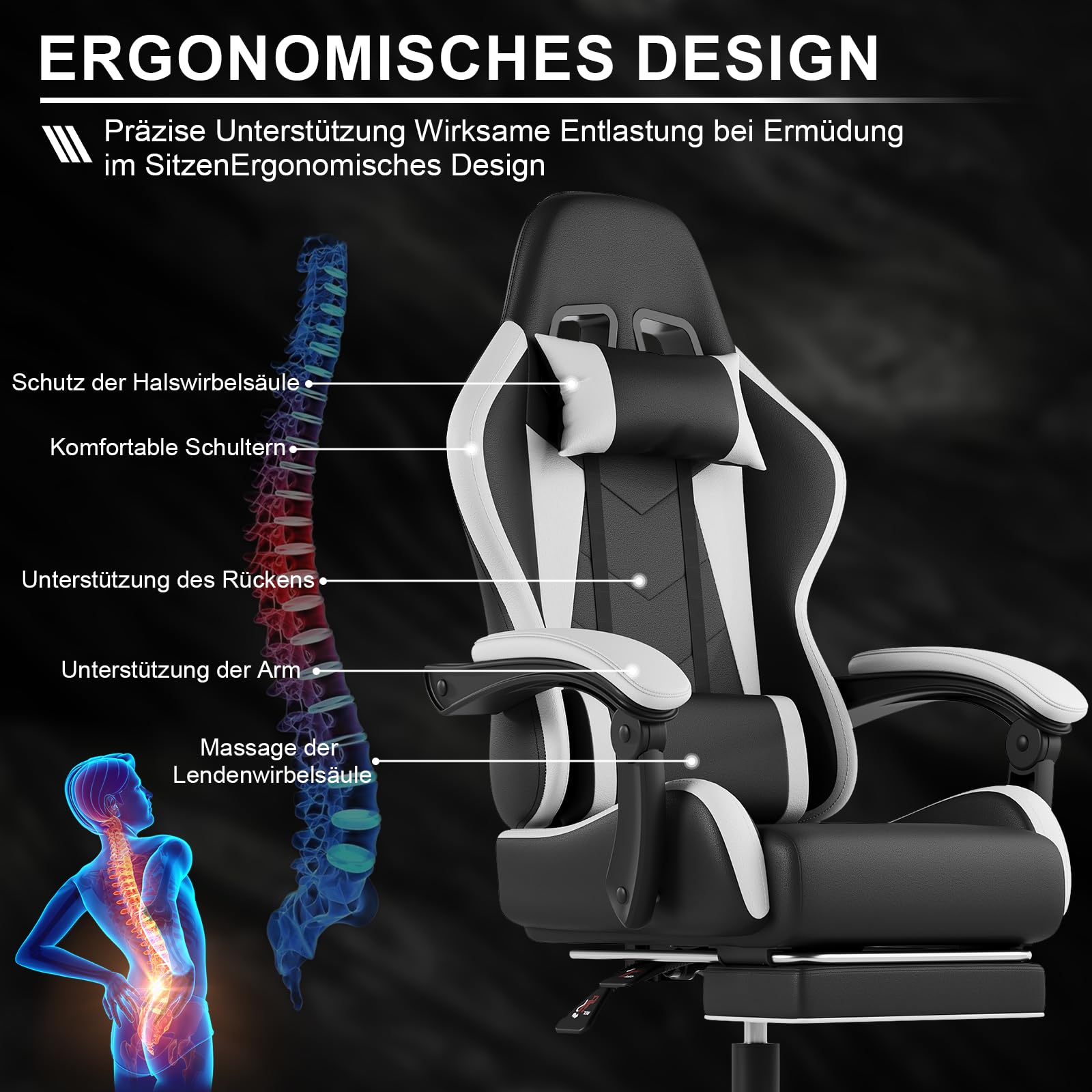 Der Devoko Gaming-Stuhl kombiniert ergonomisches Design mit Massagekomfort: Das Lendenkissen mit Massagefunktion fördert die Blutzirkulation bei langen Sitzzeiten. Mit 135° verstellbarer Rückenlehne, einziehbarer Fußstütze und extra großem Sitzkissen bietet er maximalen Komfort - ideal für Gaming, Büro oder Entspannung.