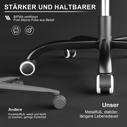 Ausgestattet mit robustem Stahlrahmen, hochwertigem PU-Leder und BIFMA-Zertifizierung - stabil bis 150 kg belastbar.