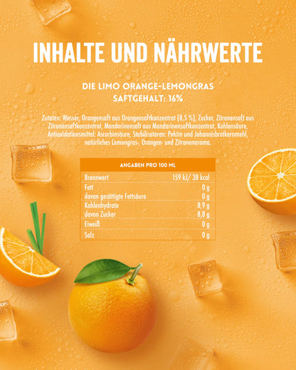 - Fruchtgehalt: Mit Orangensaft (8,5%) und echtem Lemongras-Aroma