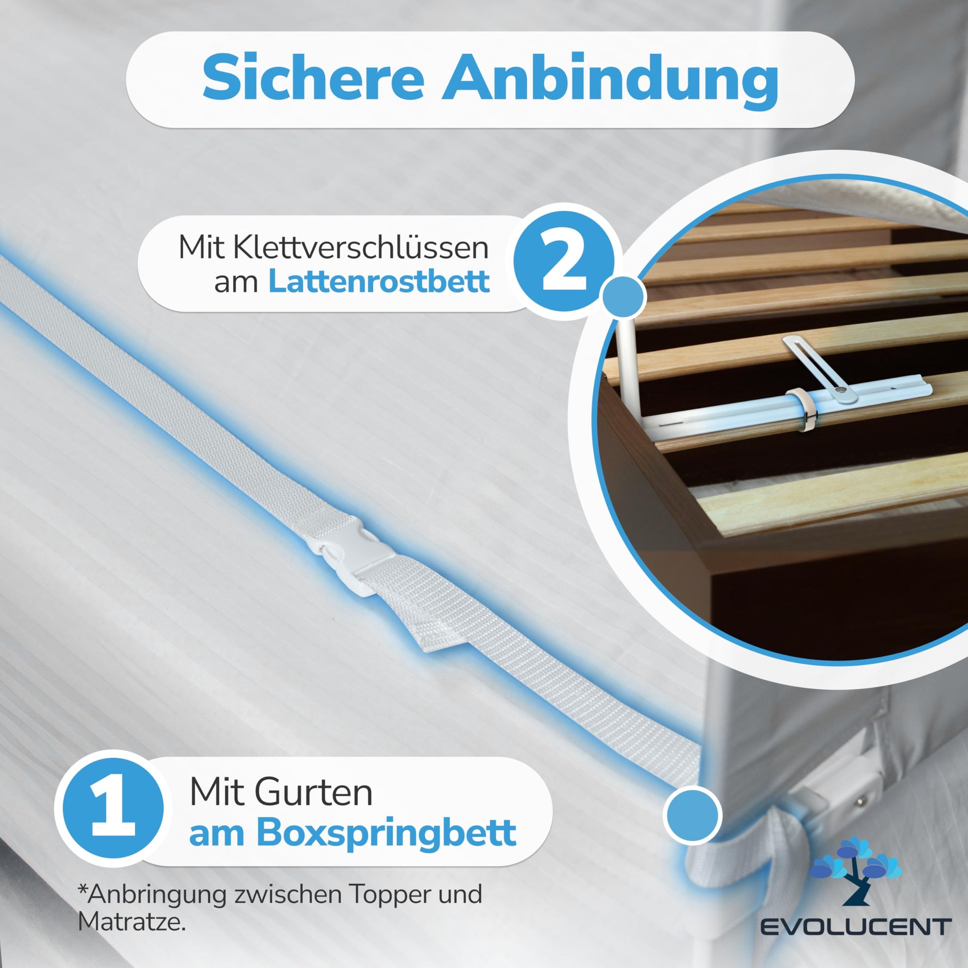 Das robuste und stabile Rausfallschutzgitter wurde speziell für Boxspringbetten entwickelt. Die extra langen Klickgurte sorgen auch bei einseitiger Nutzung für sicheren Halt. Die Montage erfolgt werkzeugfrei per Klettgurte - optional verschraubbar.