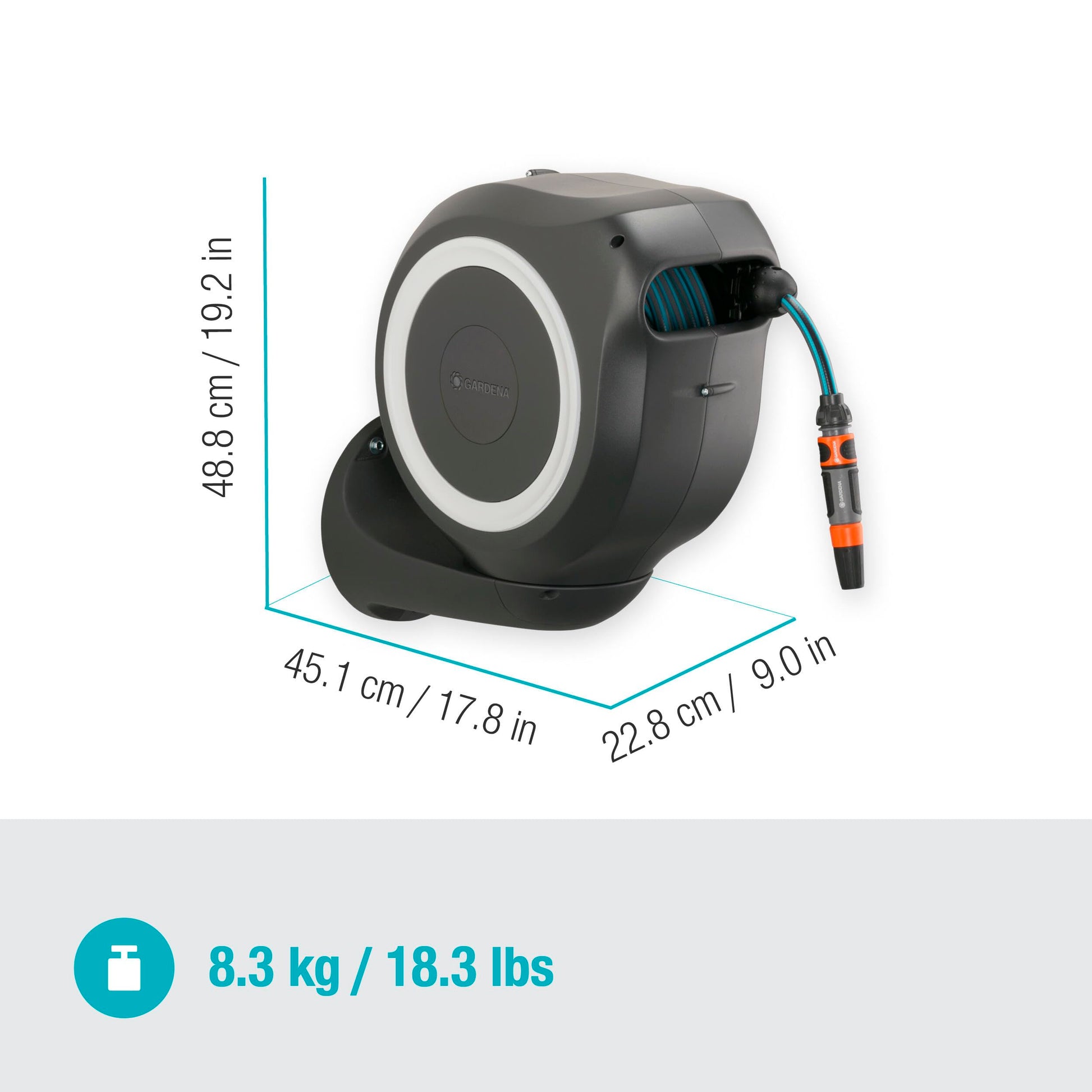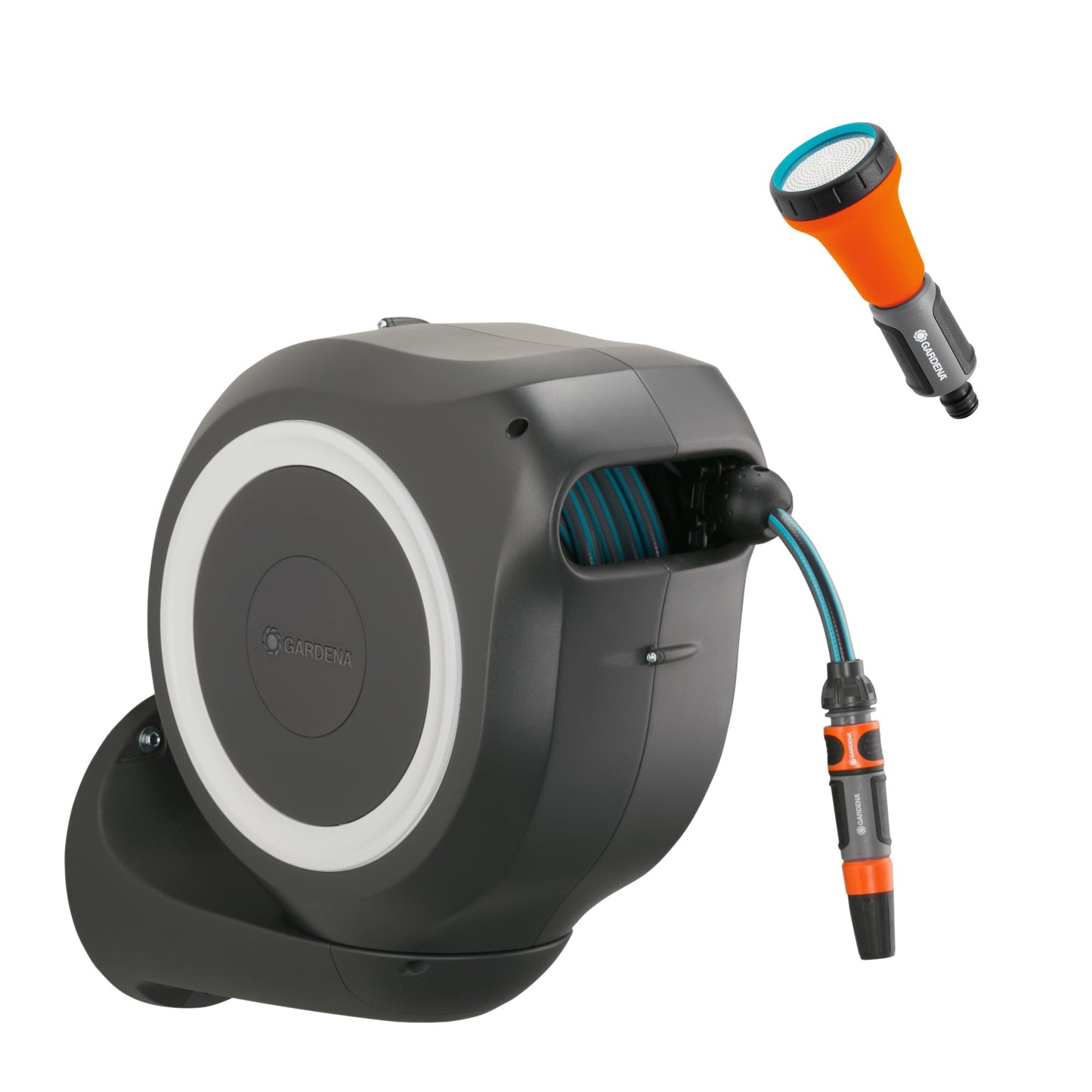 - Lieferumfang: 1x Gardena Wand-Schlauchbox, 1x Bewässerungsbrause, 1x 20 m Qualitätsschlauch (13 mm), 1x Anschlussschlauch, 1x Spritze, 1x Wandhalterung mit Schrauben und Dübeln
