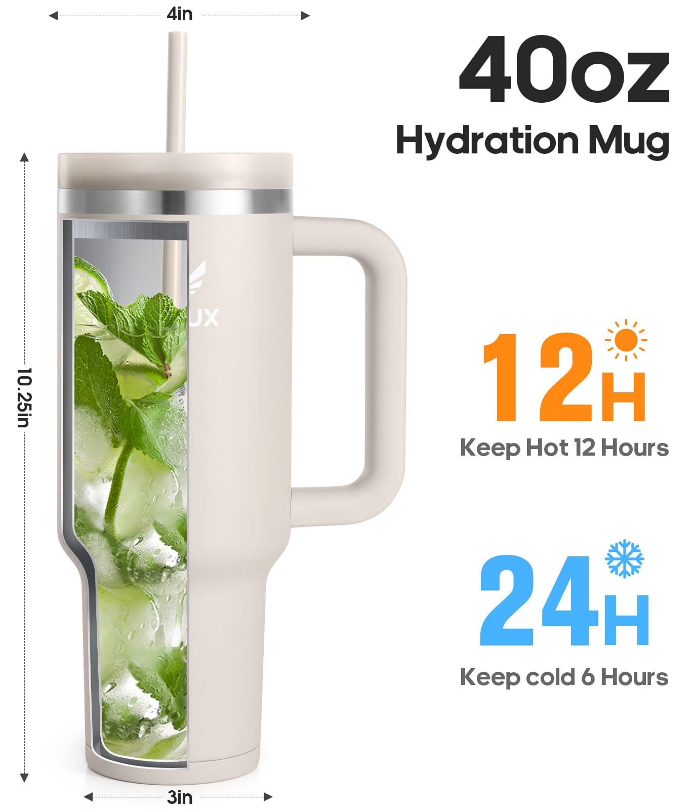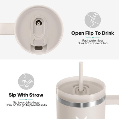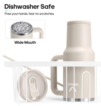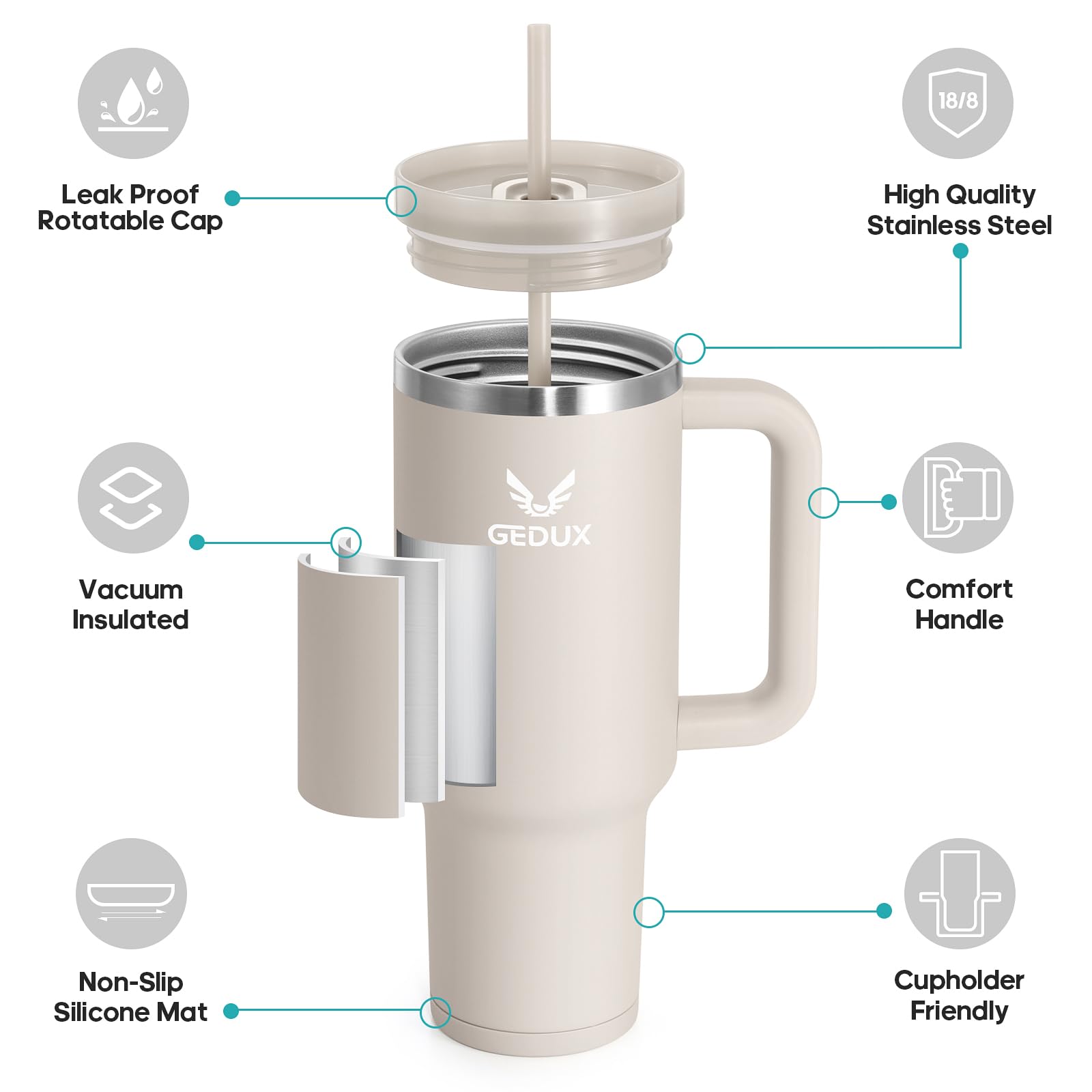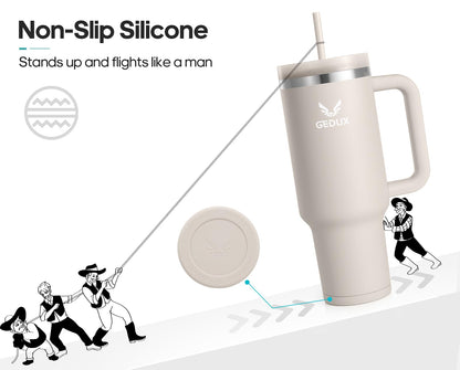 Der Gedux Isolierbecher vereint Funktion & Komfort mit einem 2-in-1-Deckel (Strohhalm oder direkt trinken), Vakuum-Isolierung aus hochwertigem 18/8-Edelstahl (24h kalt / 12h heiß) und rutschfester Silikonunterseite. Ideal für unterwegs, spülmaschinenfest und mit ergonomischem Griff & Auto-Getränkehalter-kompatibel.