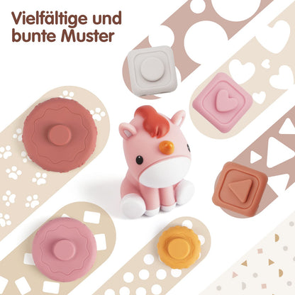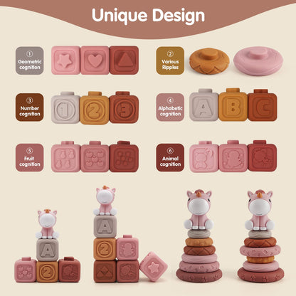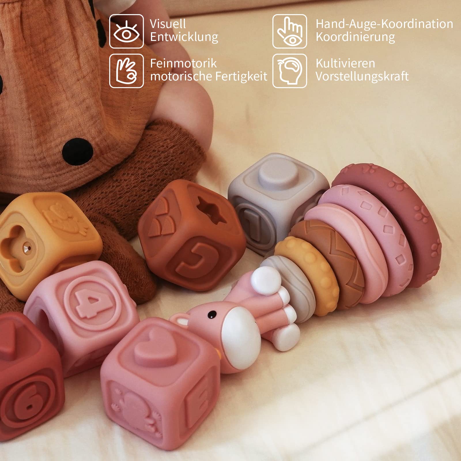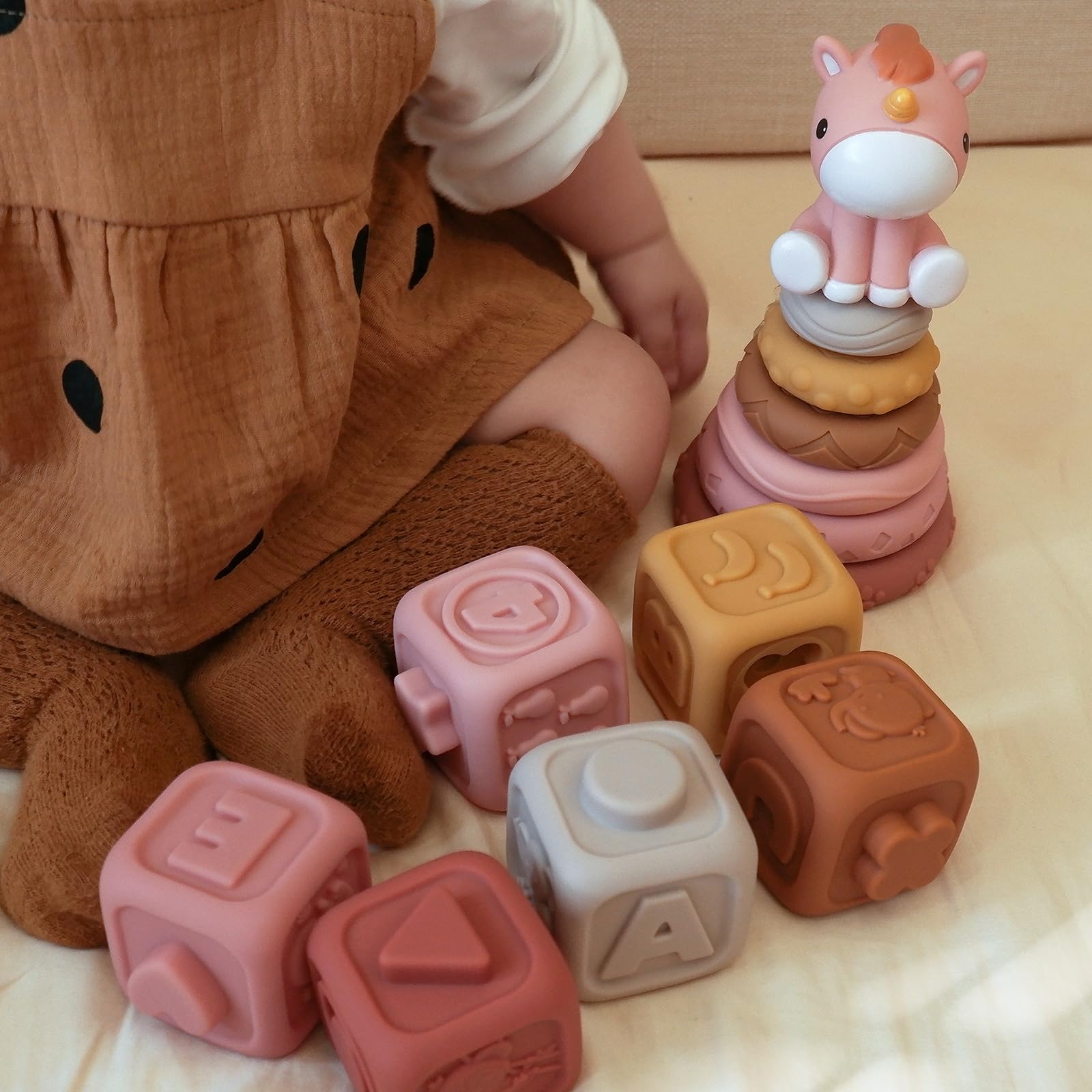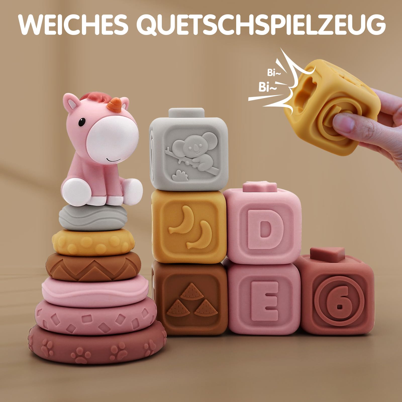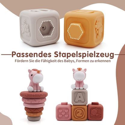 Das Gilowin Stapelspielzeug in Rosa vereint Spielspaß, Lernen und Zahnungshilfe in einem liebevoll gestalteten Set. Es enthält 6 unterschiedlich große Stapelkreise, 6 strukturierte Blöcke und ein niedliches Pferd als Abschlussfigur. Die pastellfarbenen Elemente fördern die Farbwahrnehmung, während geprägte Zahlen, Tiere und Formen die sensorische Entwicklung und Feinmotorik unterstützen.