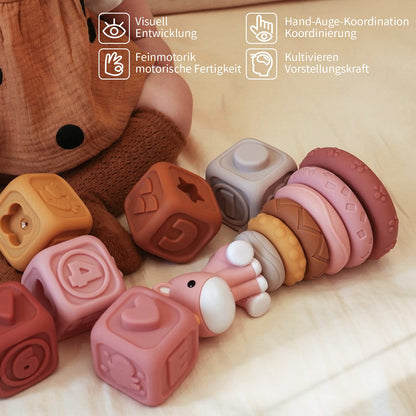 Die Bausteine bestehen aus weich-kau barem, lebensmittelechtem Silikon - perfekt als Beißhilfe bei Zahnungsschmerzen. Dank Luftloch erzeugen sie beim Drücken ein leises Geräusch und regen die Hörentwicklung an. Das Set ist leicht zu reinigen und ideal für kleine Hände.