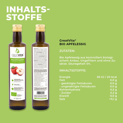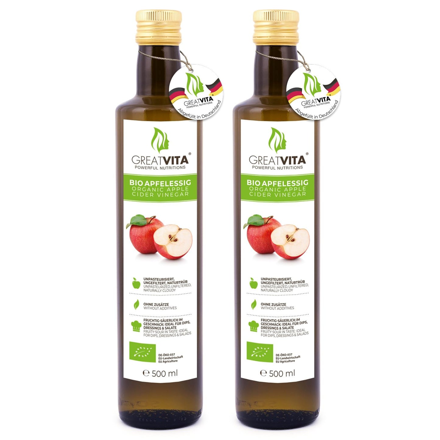 GreatVita 100% Bio Apfelessig (2x 500ml - 1 Liter): Naturtrüb & ungefiltert aus biologischem Anbau