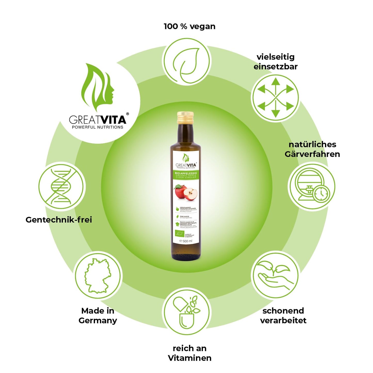 GREAT VITA Bio Apfelessig überzeugt mit fruchtig-säuerlichem Geschmack und reiner Naturbelassenheit - ideal für die bewusste Ernährung.
