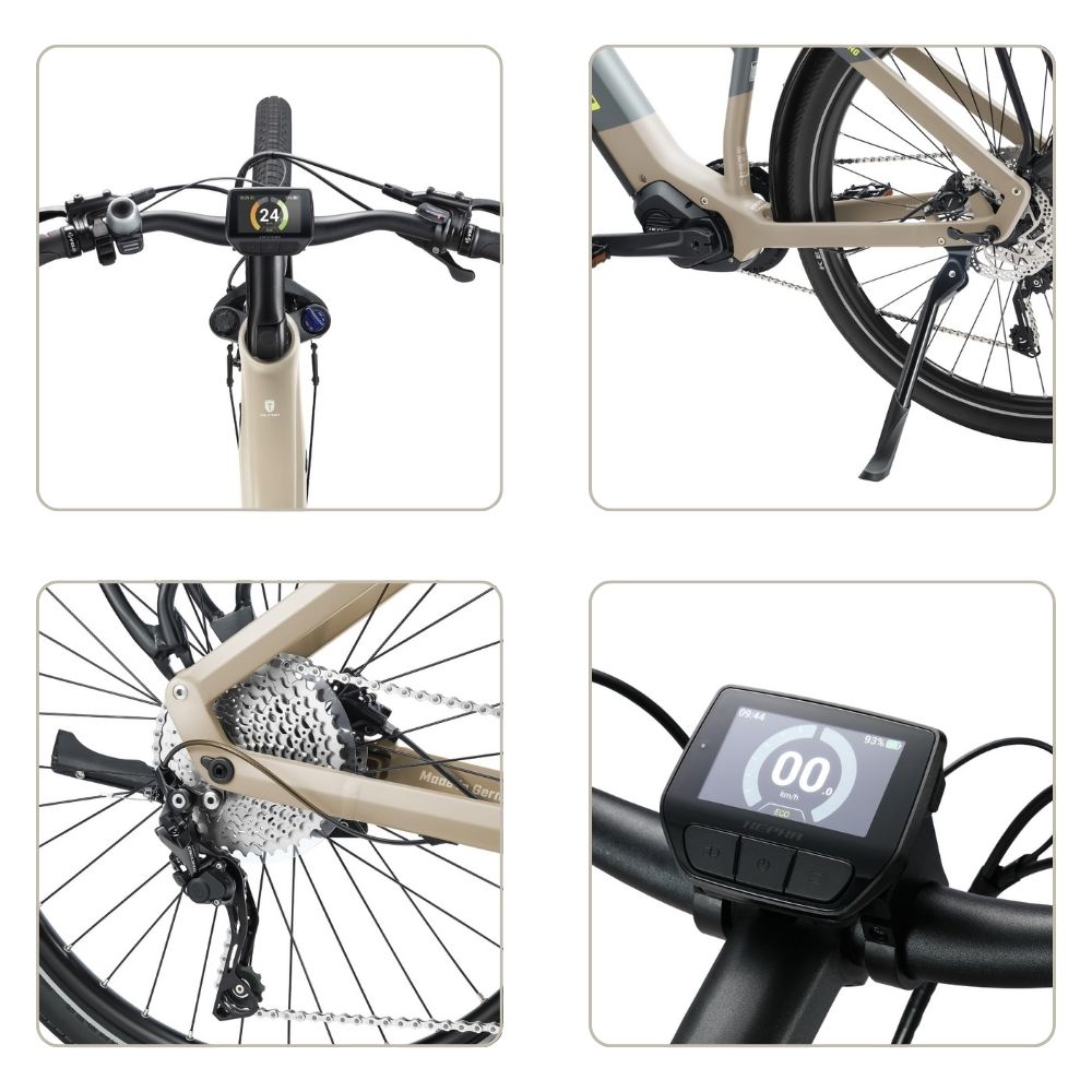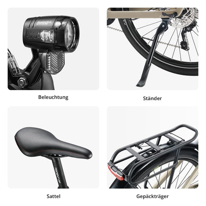 Ausstattung: Hydraulische Scheibenbremsen, 10-Gang-Schaltung, Suntour-Federgabel (63mm), automatische Lichtsteuerung