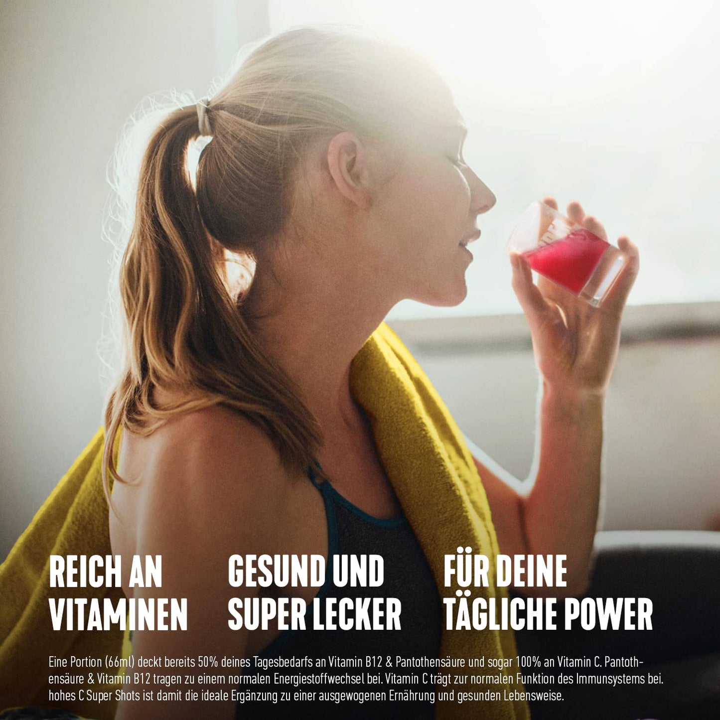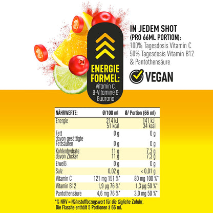 Mit einer Mischung aus Orange, Cranberry und Guarana-Extrakt bieten diese Shots nicht nur einen außergewöhnlichen Geschmack, sondern versorgen deinen Körper mit 100% Vitamin C, 50% Vitamin B12 und Pantothensäure pro Portion.