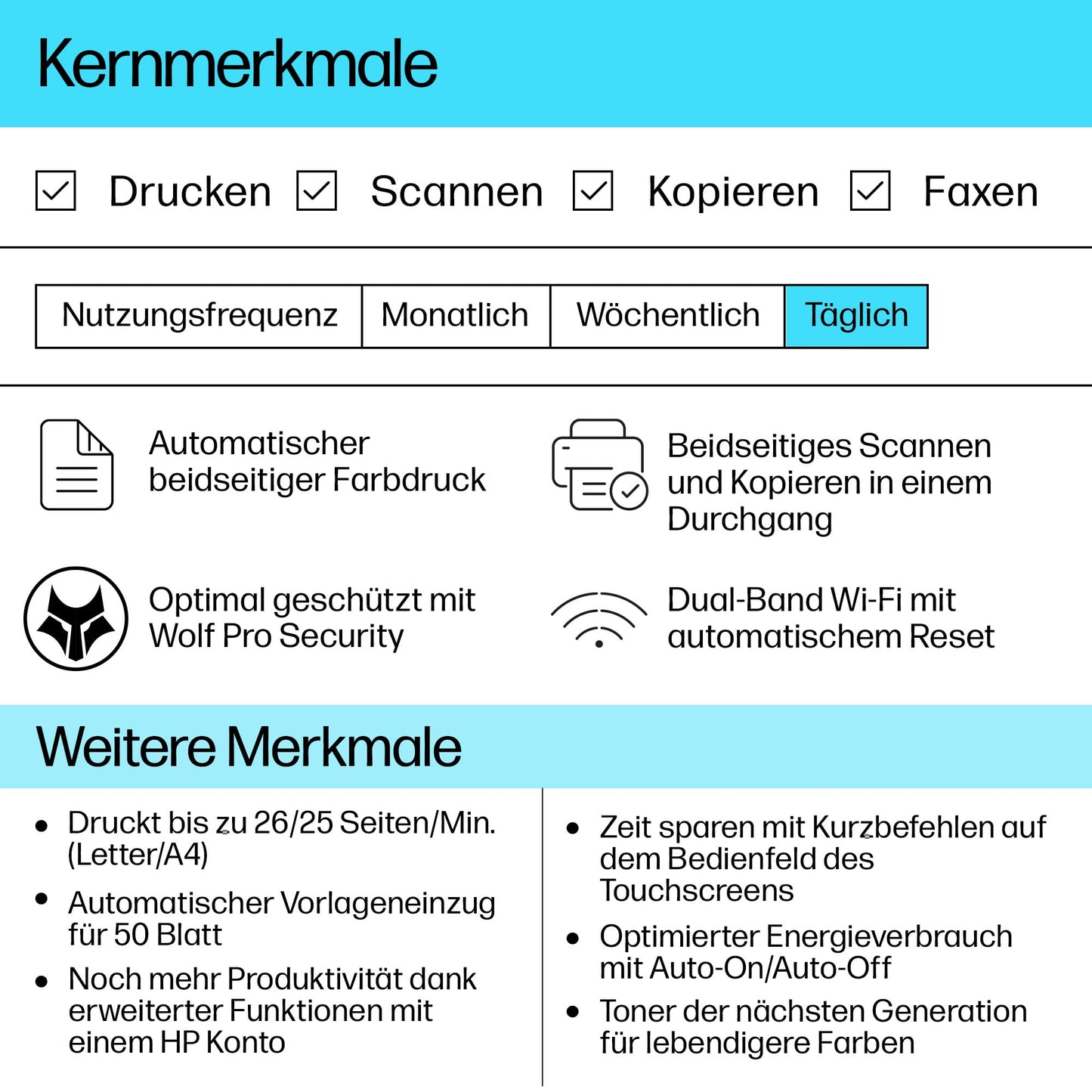 Strahlende Druckqualität: Die neu entwickelte HP TerraJet Tonertechnologie liefert lebendige, realitätsnahe Farben bei gleichzeitig niedrigem Stromverbrauch. Unterstützt von HP Wolf Pro Security bleibt dein System vor Manipulation und Datenmissbrauch bestens geschützt.