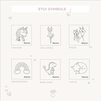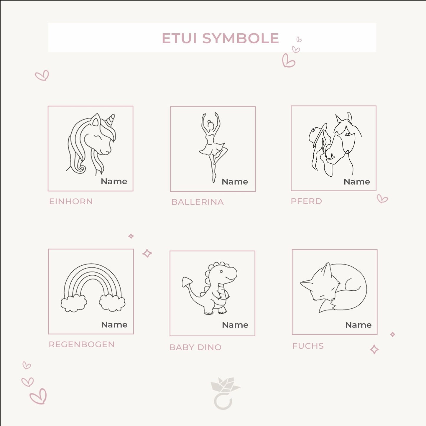 Die Kette wird in einem modernen, schwarzen Etui geliefert, das individuell mit einem von sechs süßen Motiven (Einhorn, Ballerina, Pferd, Regenbogen, Fuchs, Baby Dino) personalisiert werden kann. Ergänzt wird das Set durch eine Grußkarte, die Sie mit dem Namen des Kindes versehen können, sowie ein Schmuck-Zertifikat - ein fertiges Geschenk-Set für strahlende Kinderaugen.