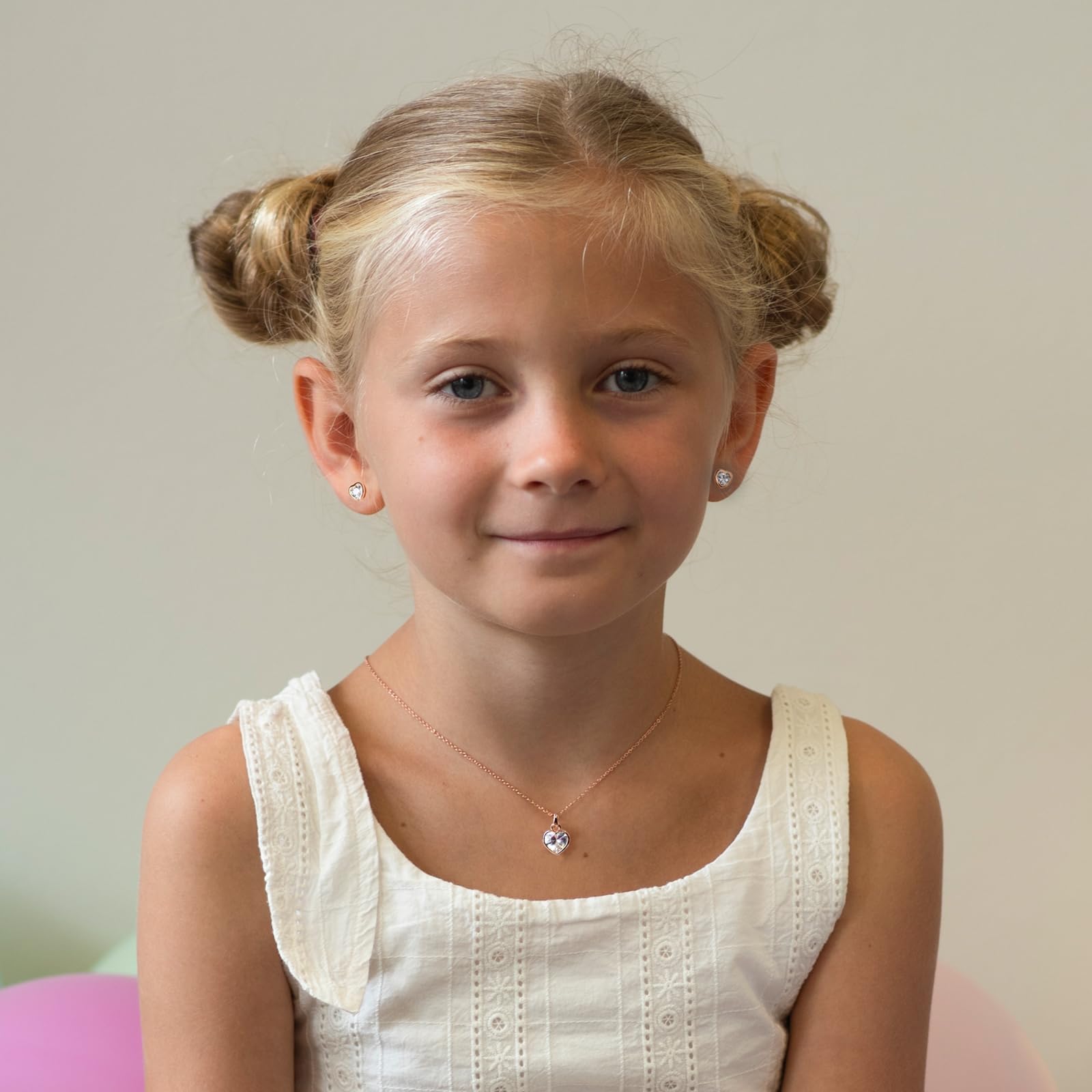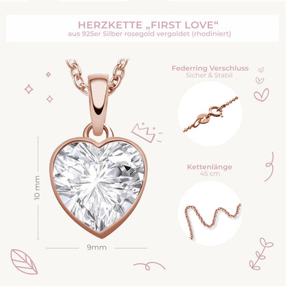 Die bezaubernde Kinder-Herzkette "First Love" von Amoonic verbindet hochwertige Handwerkskunst mit kindlicher Eleganz. Gefertigt aus 925 Sterling Silber, roségold vergoldet und nickelfrei, besticht die Kette mit einem zarten Herzanhänger (10x9mm) und einem handgefassten, glitzernden Zirkonia-Stein in Herzform. Die 45cm lange Kette schließt sicher mit einem stabilen Federringverschluss und ist rhodiniert, um dauerhaften Glanz und Schutz vor Anlaufen zu gewährleisten.