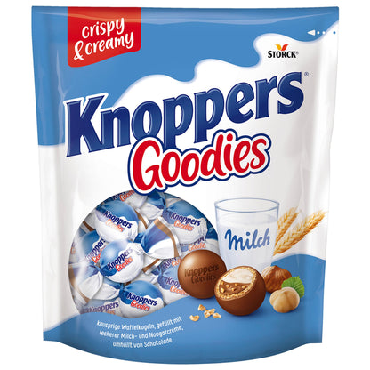 Knuspergenuss im Kugelformat: Die Knoppers Goodies vereinen zarte Milch- und Nougatcreme, knackige Haselnuss-Stückchen, knusprige Waffel und einen Überzug aus feiner Vollmilchschokolade - ideal für kleine Pausen oder zum Teilen mit Familie und Freunden.