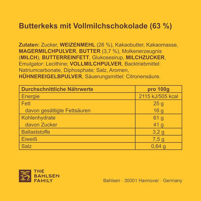 Knuspriger Butterkeks trifft auf zarte Milchschokolade - perfekt für Genussmomente zwischendurch, zum Teilen oder für den Verkauf.