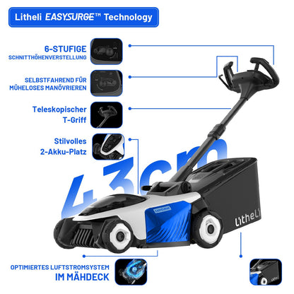Litheli Easysurge Akku Rasenmäher inkl. 2x4,0Ah Akkus: Selbstfahrend (2,2-4,7 km/h), Bürstenloser Motor