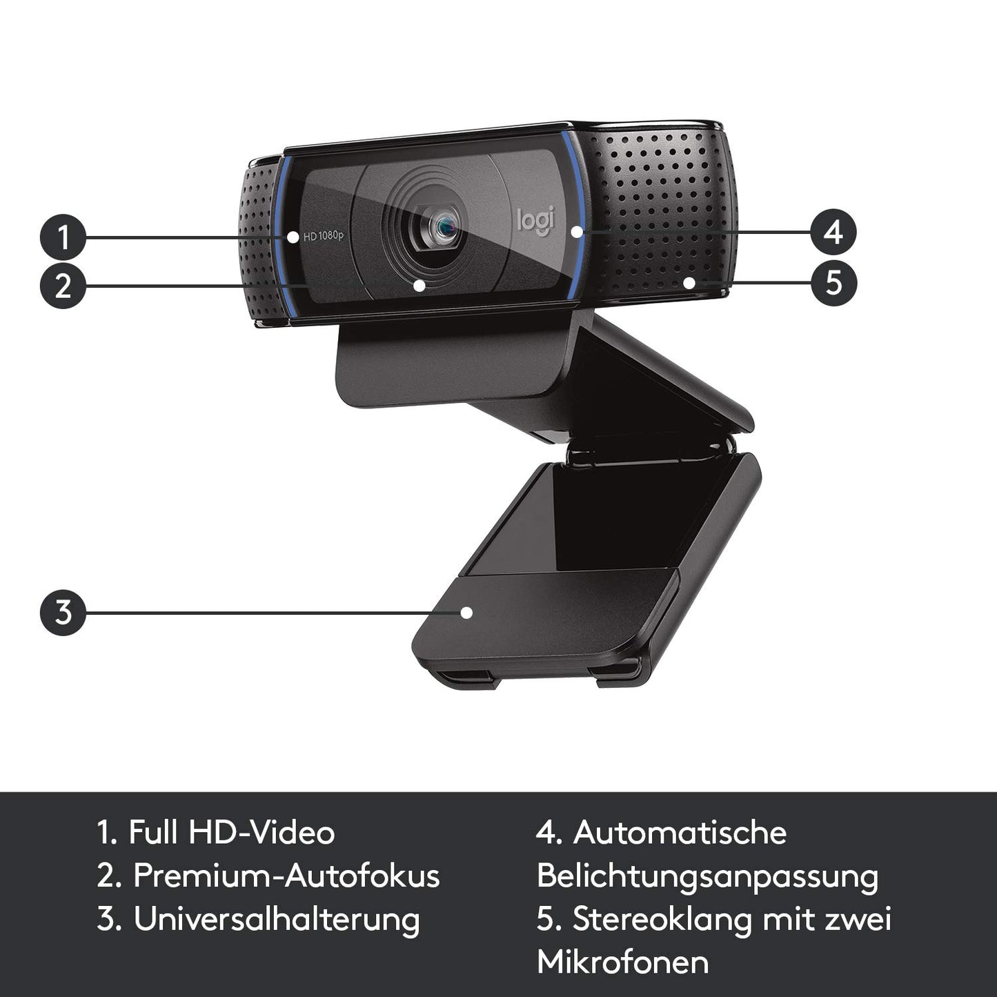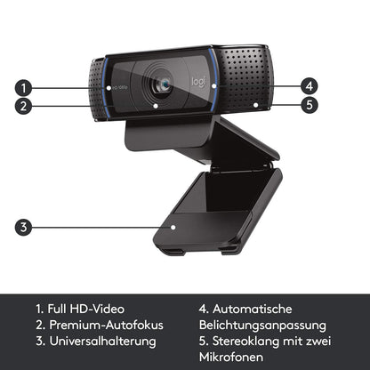 LOGITECH C920 HD Pro Webcam USB schwarzpFull HD-Videos in 1080p - dank H.264-Videostandard schneller, flüssiger und auf mehr Computern.br Führen Sie Videogespräche mit atemberaubender Bildqualität in Full HD 1080p-Auflösung über Skype.br Logitech Fluid Crystal -Technologie. Damit Ihre Logitech Webcam noch mehr leistet. Sorgt für flüssige Bewegungen, scharfe Bilder mit realistischen Farben und klaren Sound.br Genießen Sie HD-Videogespräche im Breitbildformat (720p) mit den meisten Instant Messengern und Logitech Vid HD.br Laden Sie HD-Videos in 1080p mit einem einzigen Klick auf Facebook, Twitter und YouTube hoch, damit Ihre Freunde und Familie immer auf dem Laufenden sind.br p