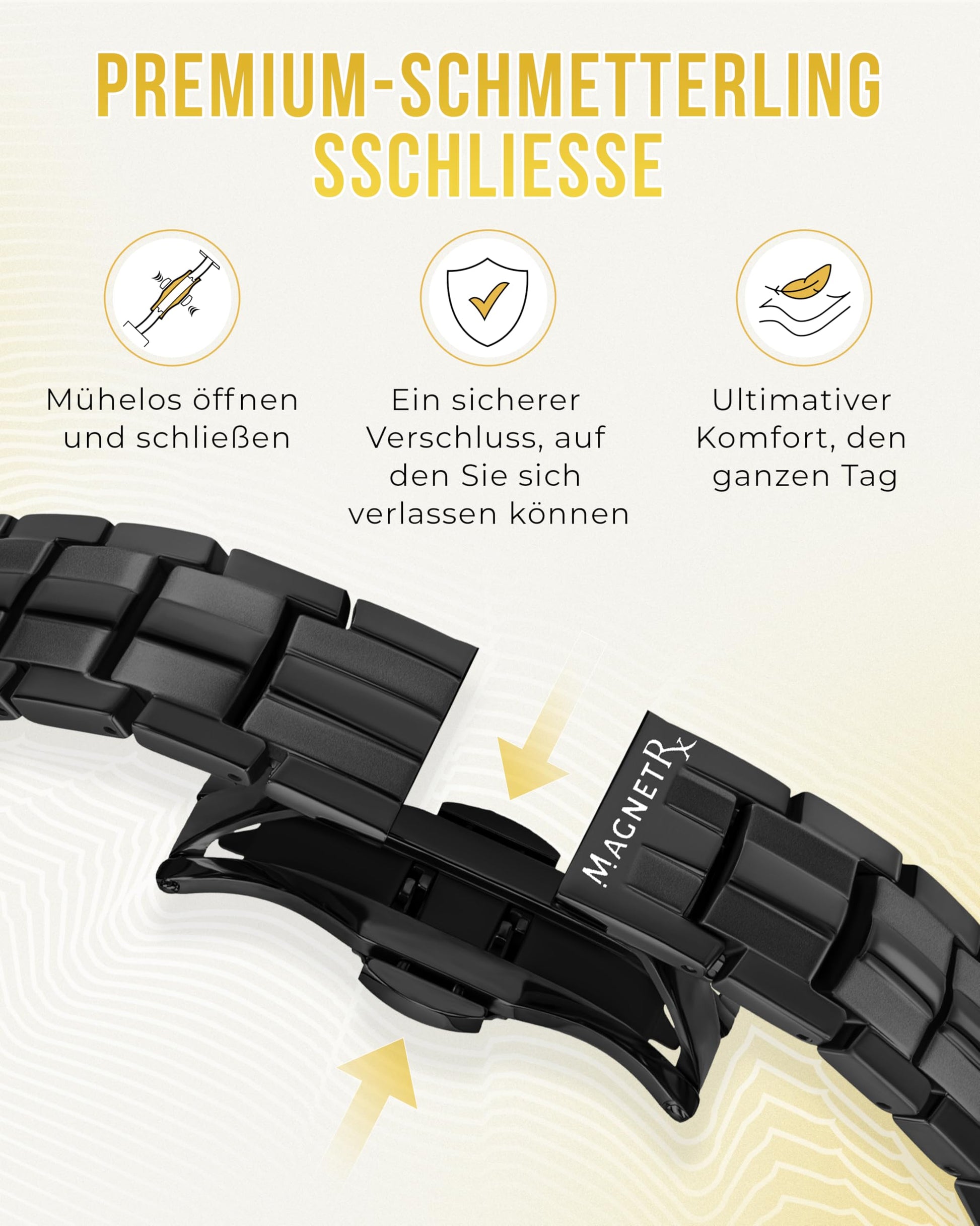 Mit einer Länge von 22,9cm und dem mitgelieferten Werkzeug ist das Armband leicht verstellbar und dank des exklusiven Butterfly-Verschlusses sicher und komfortabel im Alltag tragbar. Wasserdicht und hypoallergen, eignet sich das Armband perfekt für den täglichen Einsatz.