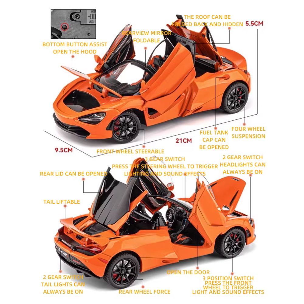 Ein Traum für Sammler und kleine Auto-Fans: Dieses hochwertige McLaren 720S Modell im Maßstab 1:24 überzeugt durch seine massive Metallausführung, detailverliebte Features und interaktive Funktionen.