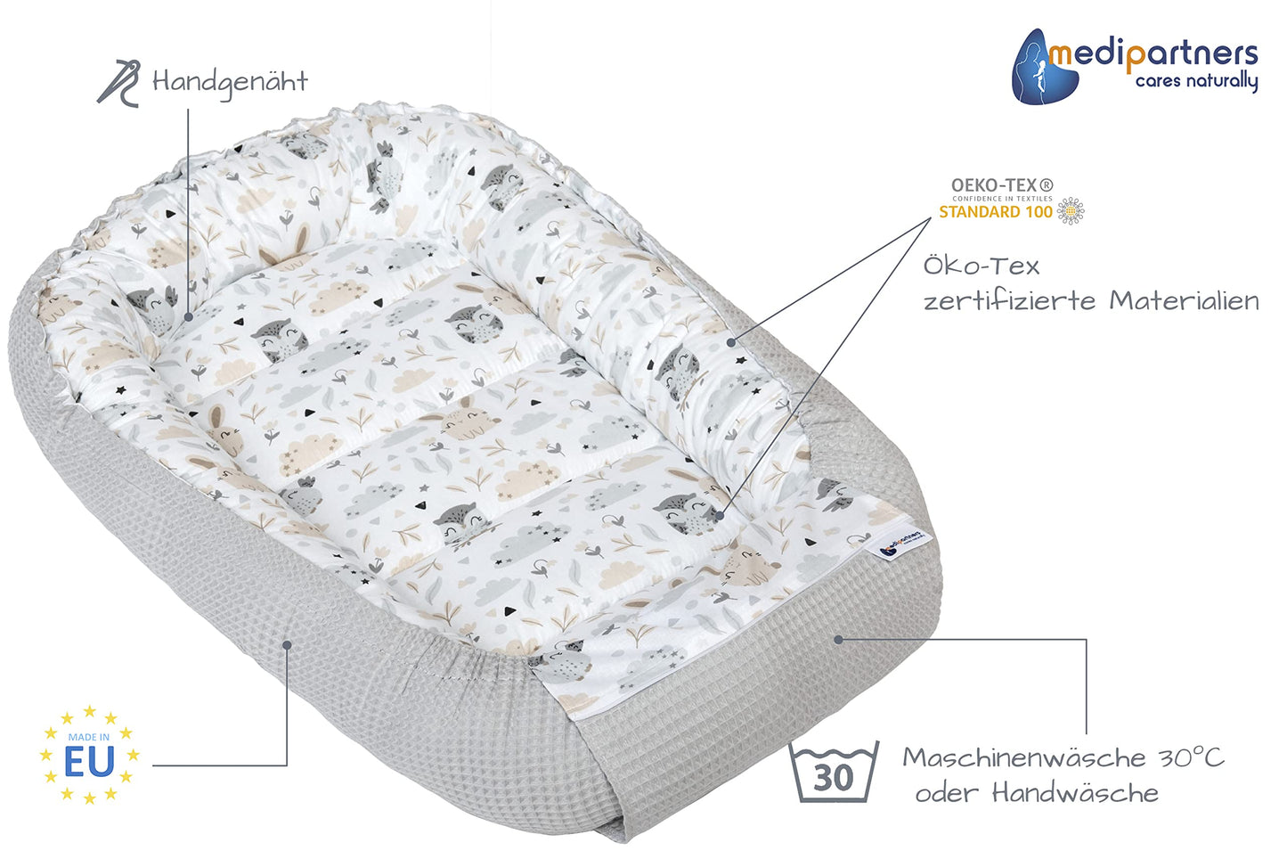 Geborgen schlafen wie im Mutterleib - das handgenähte Babynest von Medi Partners bietet Sicherheit, Komfort und Qualität „Made in EU“.