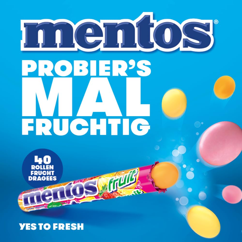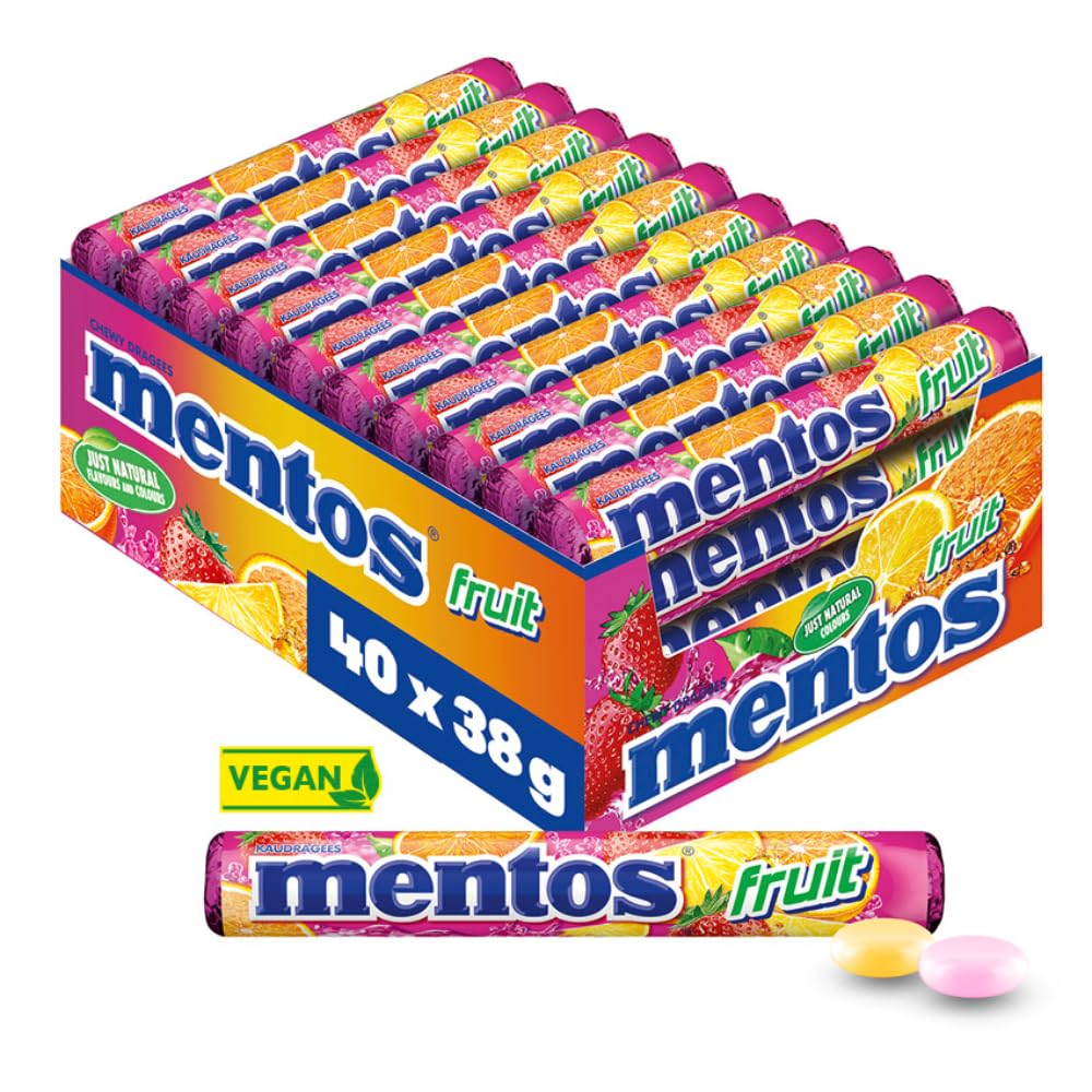 Mentos Fruit Dragees, Frucht-Bonbons mit Orange, Zitrone, Erdbeere, Kaubonbons mit fruchtigem Geschmack, Süßigkeiten Multipack (40 Rollen), vegan