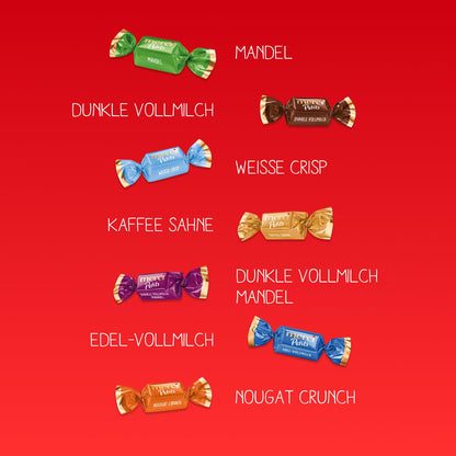 - Bunte Mischung aus Kaffee-Sahne, Edel-Vollmilch, Praliné, Mandel, Dunkle Vollmilch, Weisse Crisp & Nougat Crunch