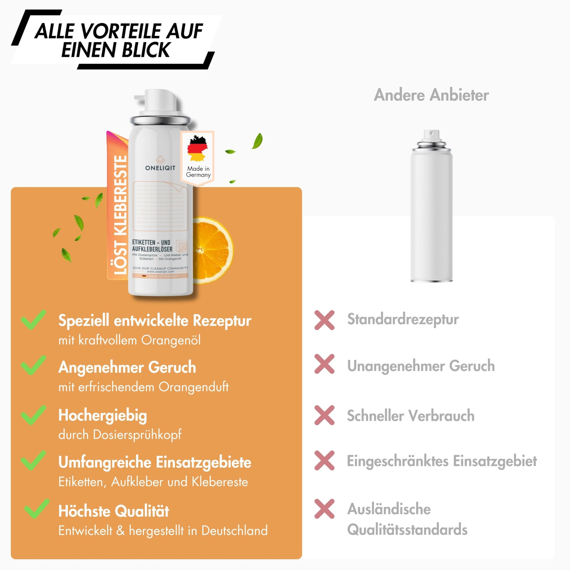 Entfernt zuverlässig Etiketten, Klebereste & Aufkleber - auch hartnäckig haftende! Mit frischem Citrusduft, ergiebiger Formel und präzisem Sprühkopf. Für viele Oberflächen geeignet (vorab testen). Made in Germany - entwickelt vom Gründerteam mit Labor am Niederrhein. Im praktischen Vorteilspack: Mehr Inhalt, besserer Preis.