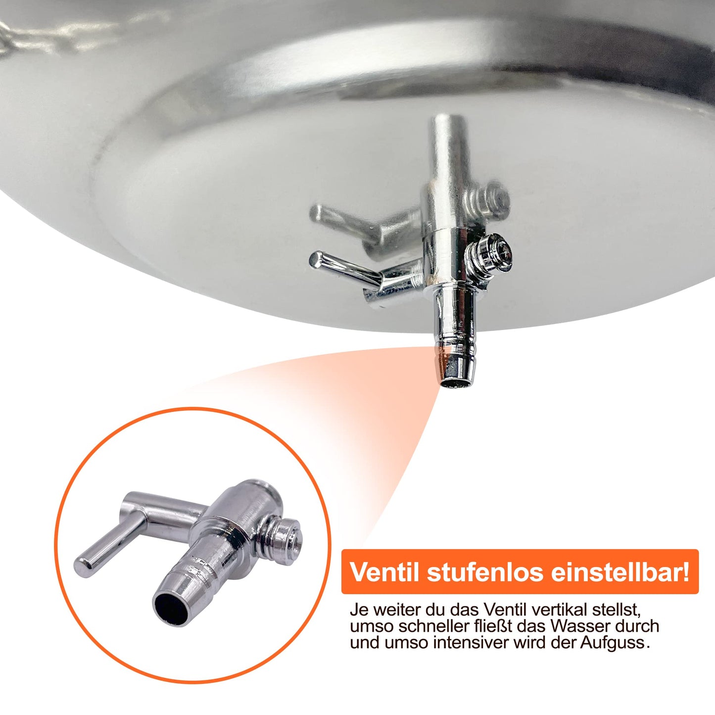 - Aufgussfrequenz: 10-20 automatische Aufgüsse bei voll geöffnetem Ventil (ca. 8-10 Minuten)