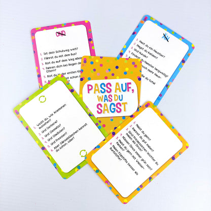 Ob du Schokolade liebst oder Fußball magst - hier musst du clever antworten, denn die Wörter „Ja“, „Nein“ und „Vielleicht“ sind strengstens verboten! Wer es schafft, ohne diese Antworten durchzukommen, beweist echte Schlagfertigkeit. Sonderkarten mit zusätzlichen Sprachverboten sorgen für noch mehr Nervenkitzel und Lacher in jeder Runde.