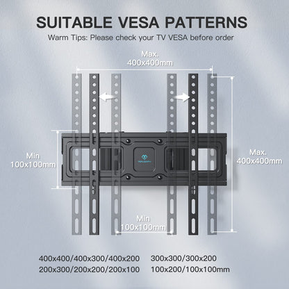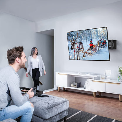 Robuste TV Wandhalterung für 26–65 Zoll große Fernseher - kompatibel mit VESA 100×100 bis 400×400 mm, bis 45 kg belastbar. Schwenkbar ±45°, neigbar +10°/–15°, nivellierbar ±3° – für optimale Blickwinkel.