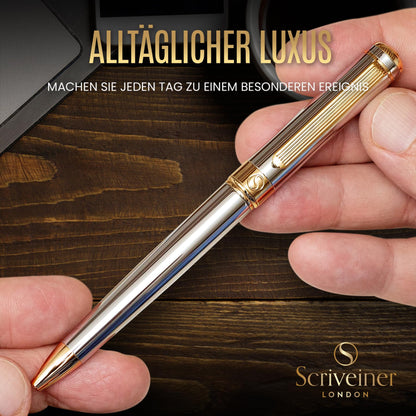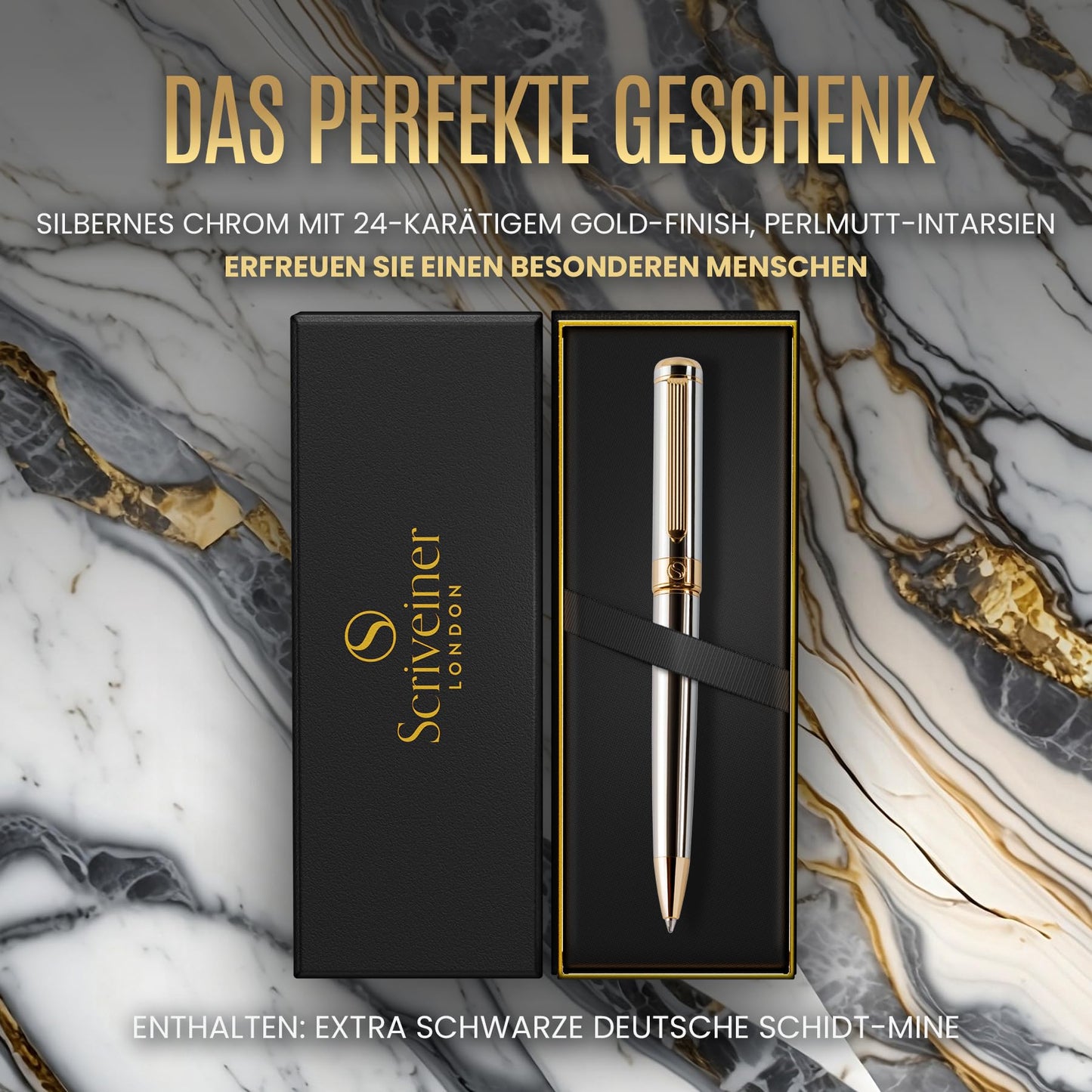 Scriveiner Kugelschreiber Hochwertiger Design Kugelschreiber in Silber mit Echtvergoldung, schwarze Schmidt Ersatzmine, Geschenkbok, Büro set, Professionelle Kugelschreiber