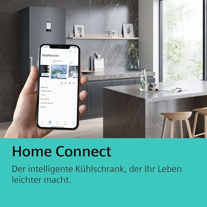 Mit Home Connect können Sie den Kühlschrank bequem über WLAN steuern. Der integrierte Eis- und Wasserspender, LED-Innenbeleuchtung und die Anti-Fingerprint-Beschichtung ergänzen die hochwertige Ausstattung dieses Kühlschranks.