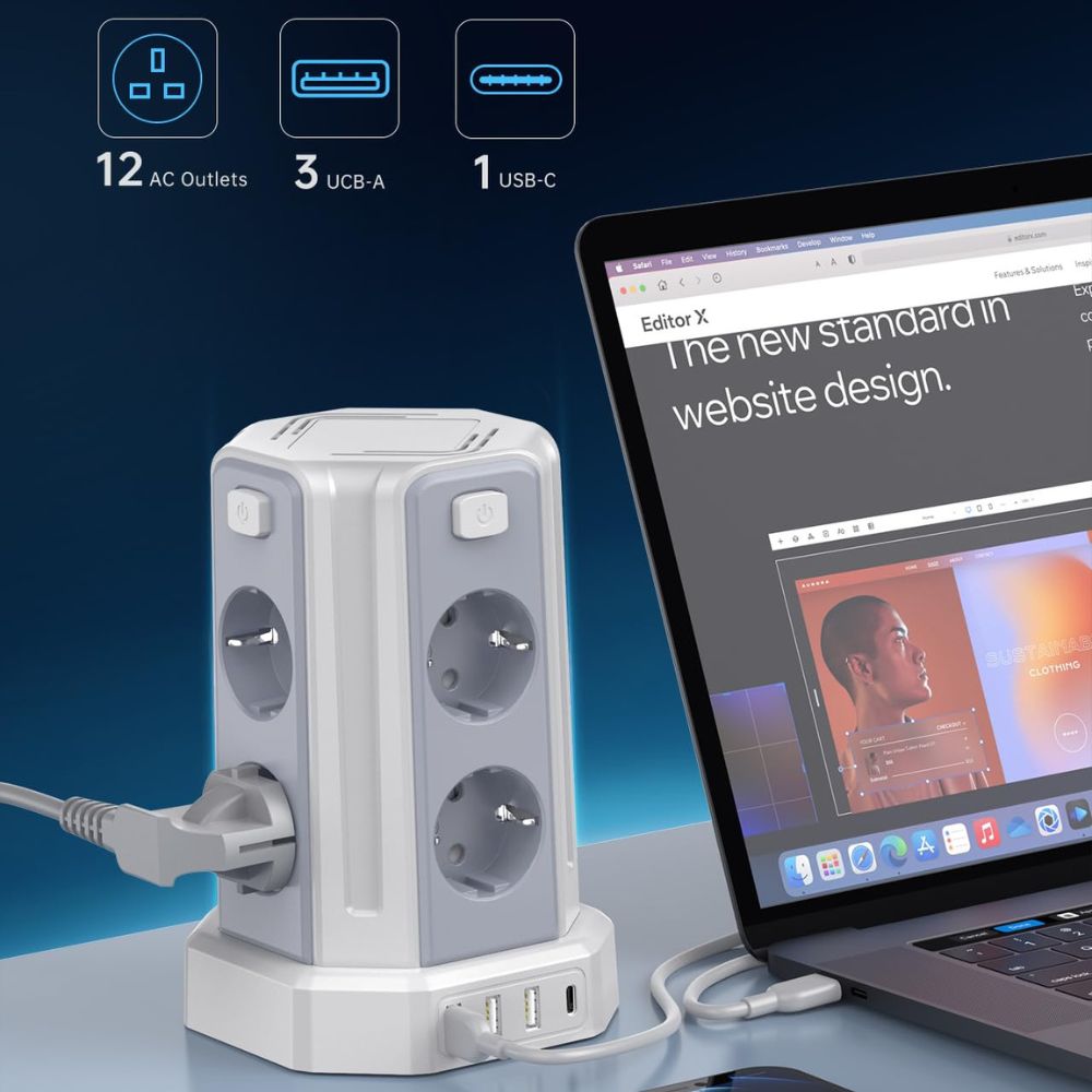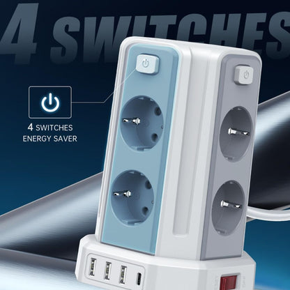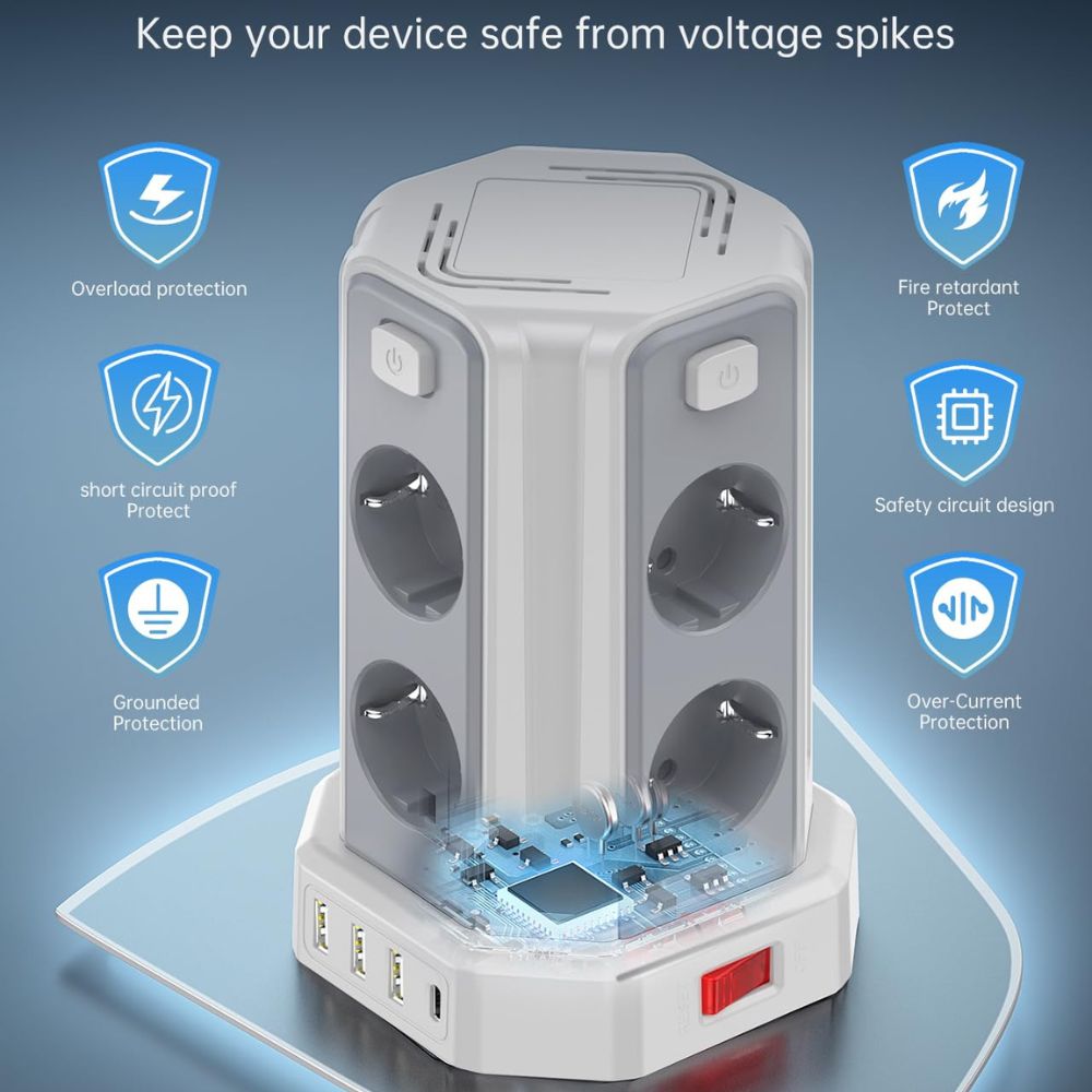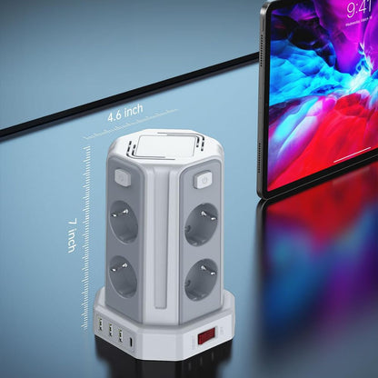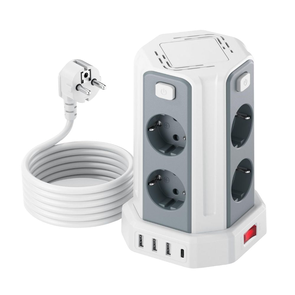 Praktischer Steckdosenturm für vielseitige Stromversorgung auf kleinem Raum.