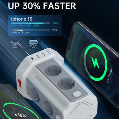 8 Steckdosen + 3 USB-A (5V/2,4A) + 1 USB-C (5V/3A): Versorgt Desktop-Geräte und lädt mobile Geräte schnell und bequem.