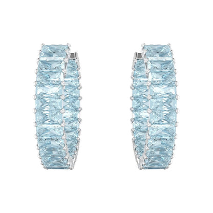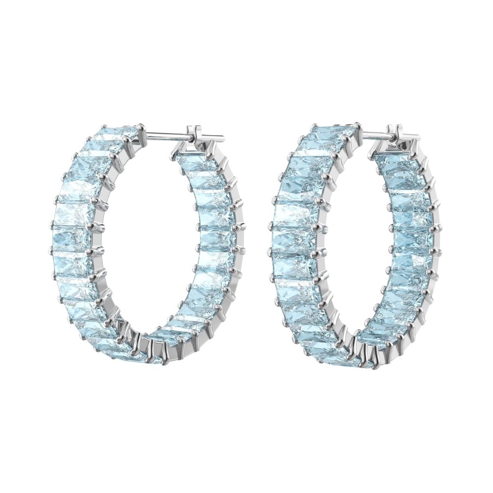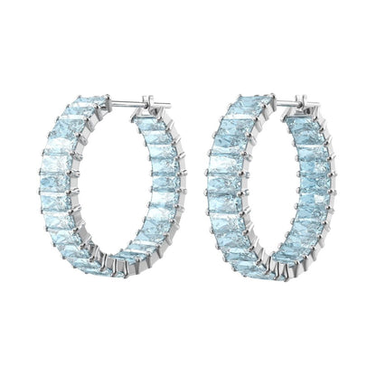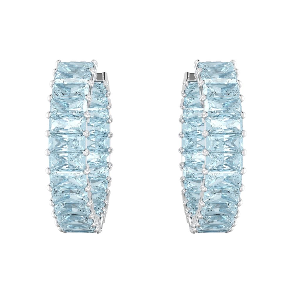 Diese raffinierten Kreolen aus der Matrix Kollektion vereinen puren Glamour mit stilvoller Zurückhaltung. Ein Kreis aus aquamarinblauen Kristallen im Baguette Princess-Schliff, eingefasst in einer rhodinierten Fassung, reflektiert das Licht mit faszinierender Präzision - ideal als stilvoller Blickfang im Alltag oder zu festlichen Anlässen.