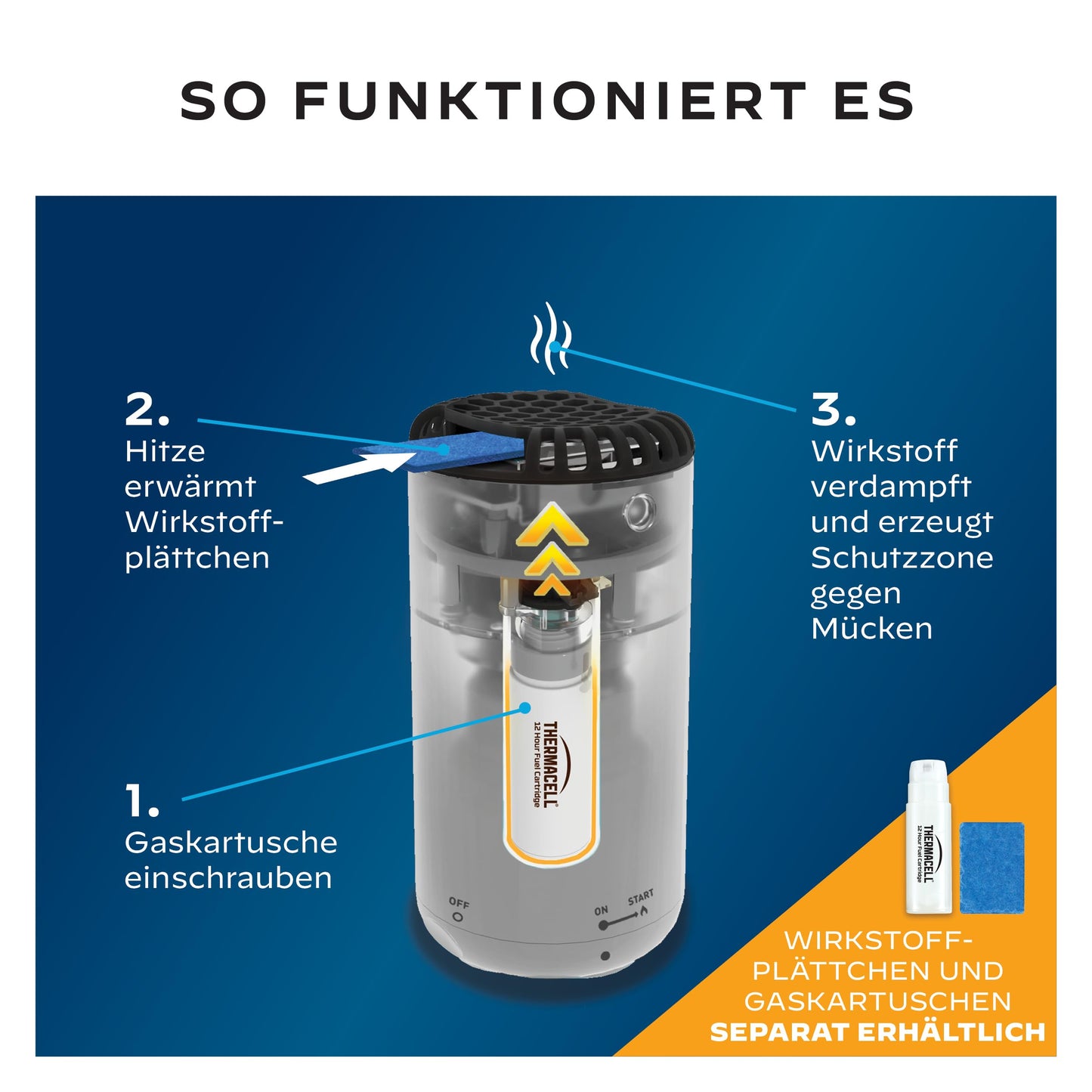 - Einfache Handhabung: Gaskartusche erhitzt das Wirkstoffplättchen, das verdampft - leise und diskret.