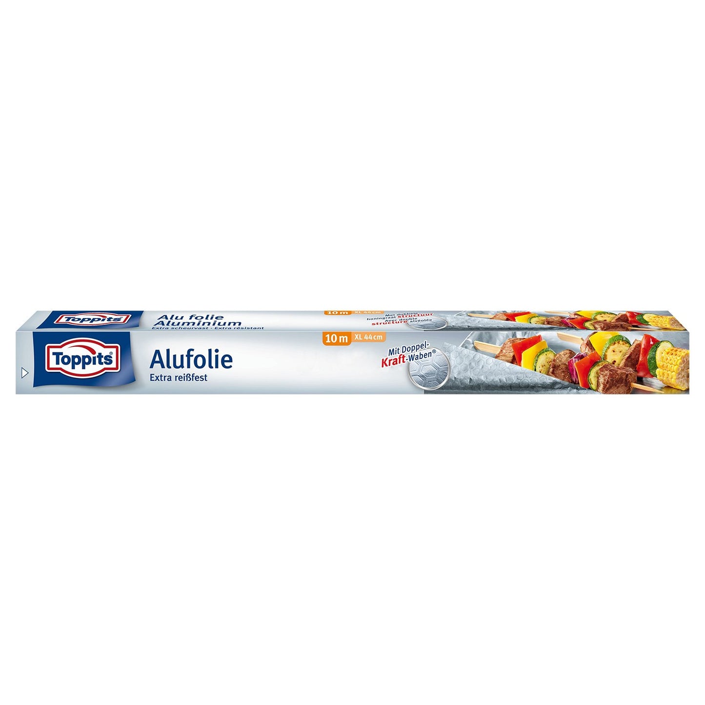 Die Toppits Alufolie im praktischen Abreißkarton überzeugt durch ihre Doppel-Kraft-Wabenstruktur, die für besonders hohe Reißfestigkeit sorgt. Mit einer Breite von 44cm ist sie ideal für große Speisen oder Grillgut geeignet.