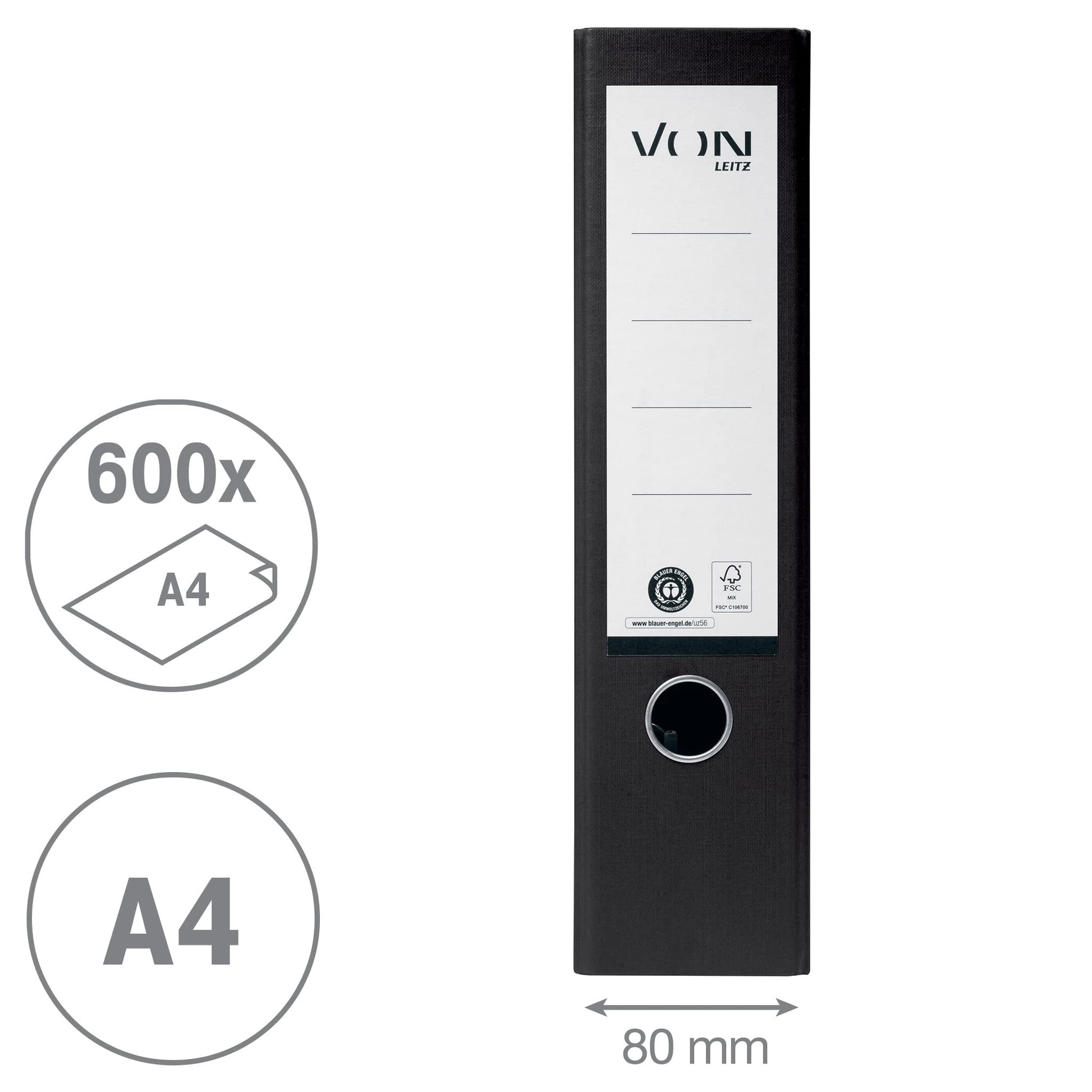 - Rückenbreite: 80mm (Platz für ca. 600 Blatt)