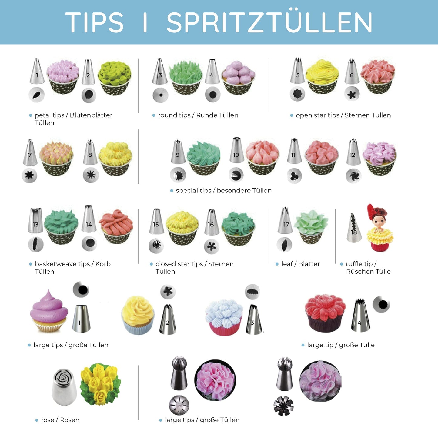 Verschiedene Tüllen: Das Set enthält 25 nummerierte Spritztüllen in verschiedenen Arten, darunter klassische, große, Ball-, russische Tüllen und Rüschentüllen - ideal für Rosen, Blätter, Sterne und Schriftzüge