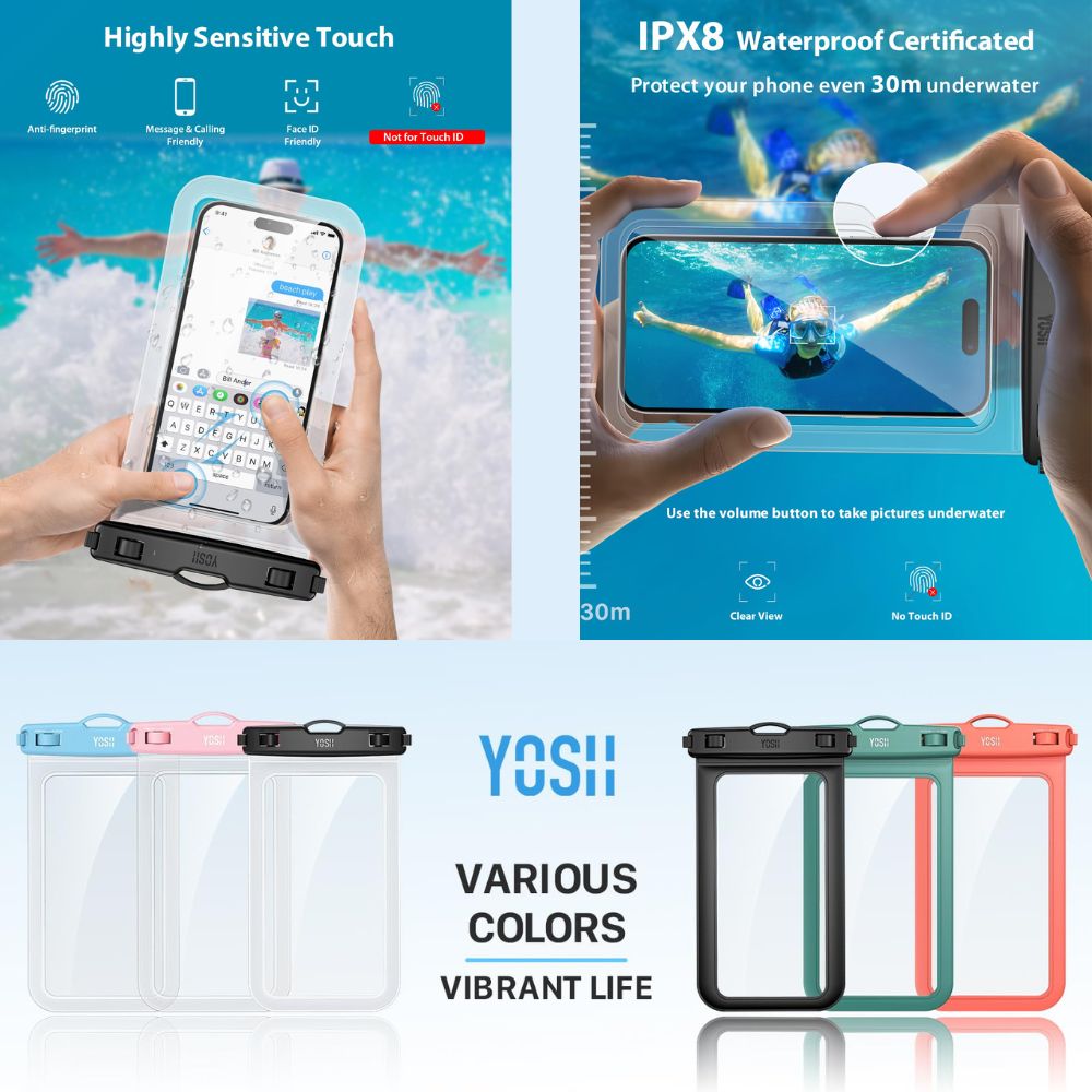 Ob am Strand, beim Schnorcheln oder auf einer Bootstour - mit der YOSH wasserdichten Handyhülle bleibt Ihr Smartphone jederzeit trocken und geschützt. Die durchdachte Verarbeitung, zertifizierte Wasserdichtigkeit und hohe Touchscreen-Sensibilität machen sie zum idealen Begleiter für Reisen, Urlaub und Outdoor-Aktivitäten.